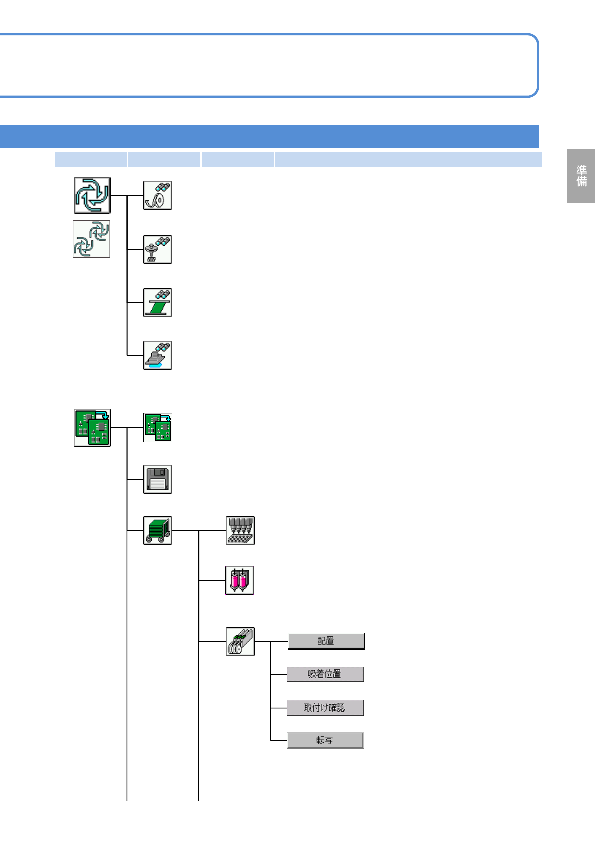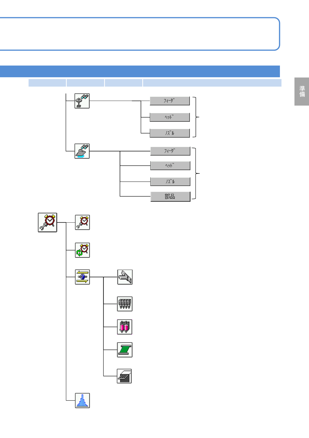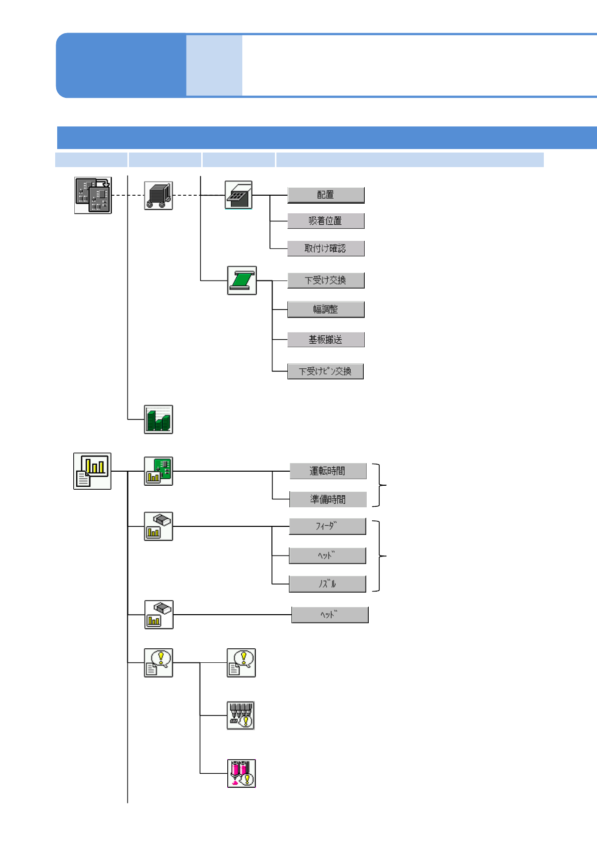 NPM-W 2 EJM7DJ-MB-02O-0 0 第 1 階層 第 2 階層 第 3 階層 第 4 階層 エンジニアモード 2 吸着情報 生産情報 メニュー 非常停止エラーの停止情報を、時刻が新しい順に最 大 20 件 表示する。 停止履歴 自動運転中に発生した真空センサーに関するエラー 情報を 新しい順に 50 件表示する。 履歴 部品吸着情報を表示する。 稼働情報 真空センサーエラー履歴 2-2-2 -7 ステージごとの稼働時間情…