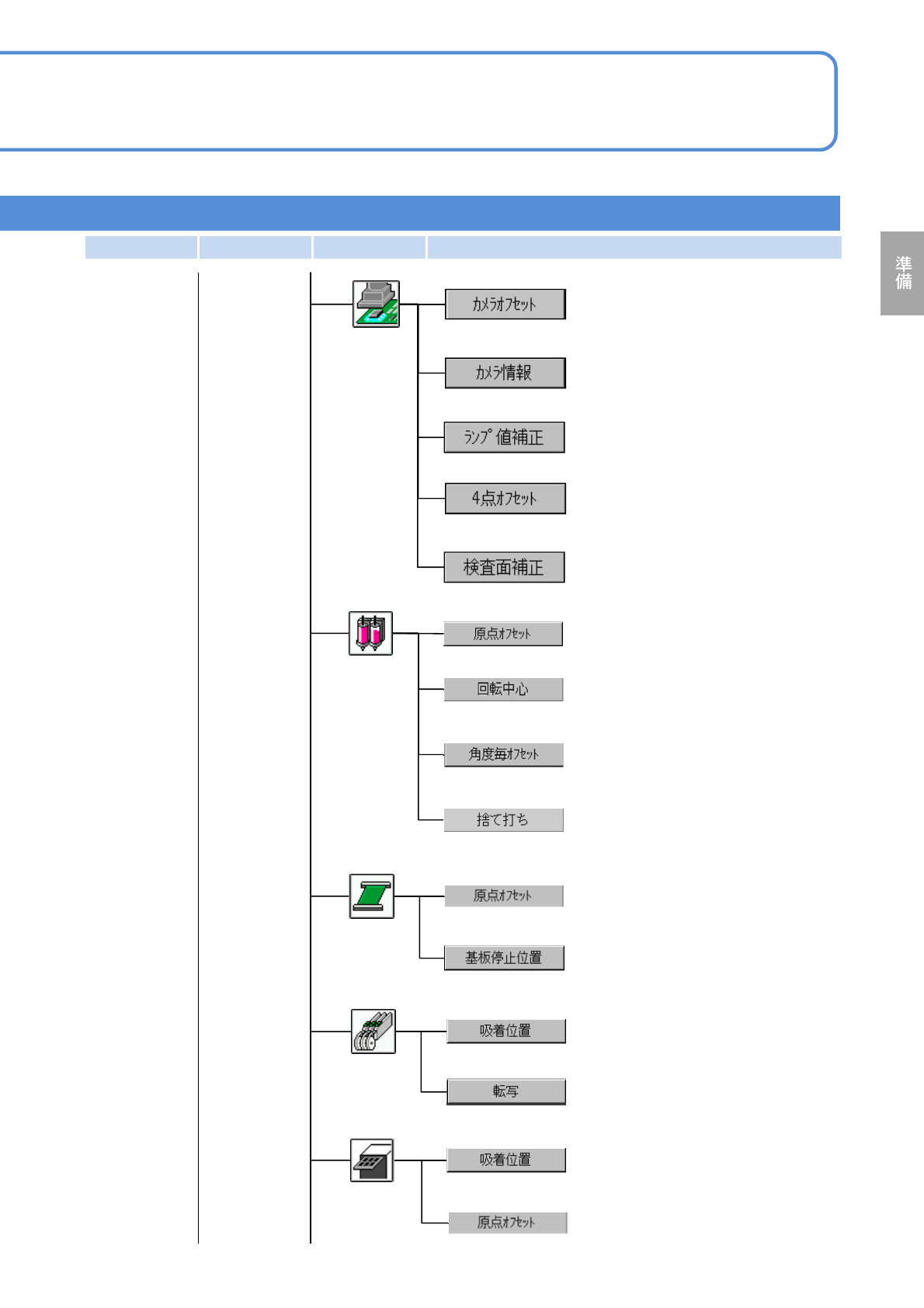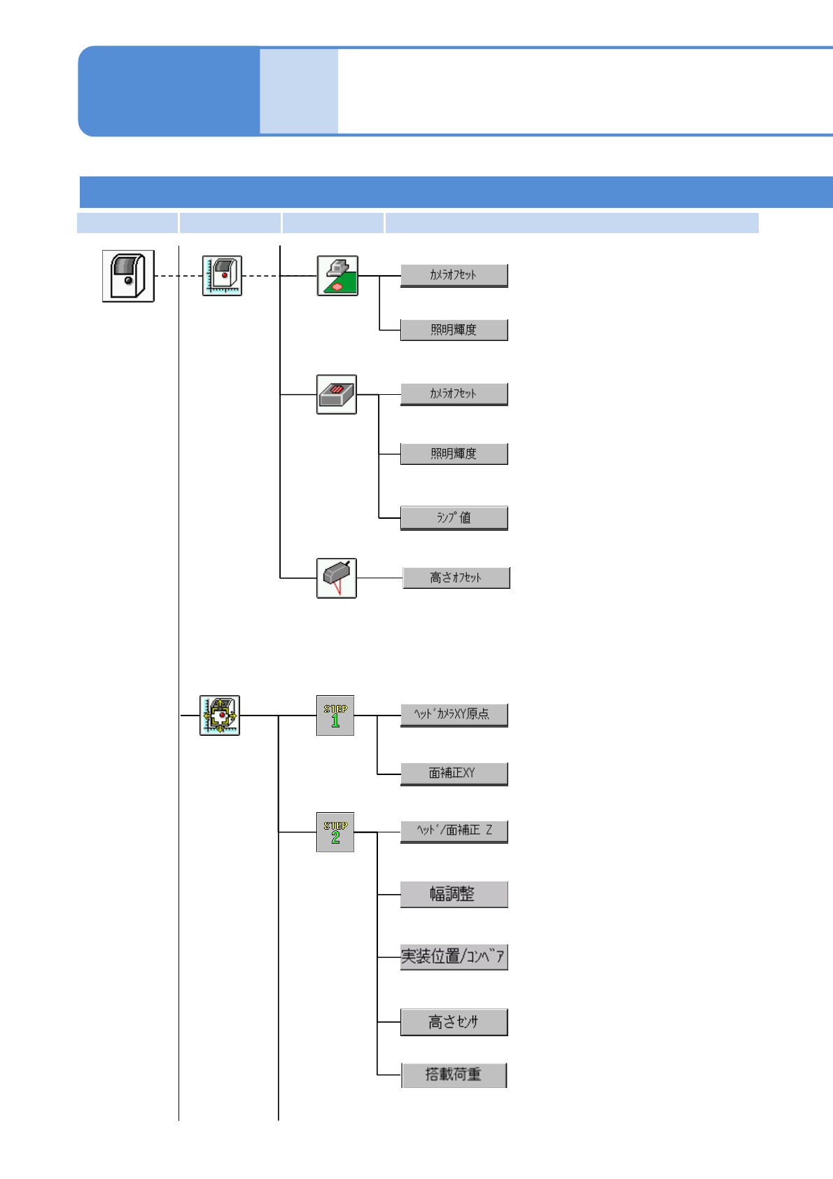 NPM-W 2 EJM7DJ-MB-02O-0 0 第 1 階層 第 2 階層 第 3 階層 第 4 階層 2-2-2 -16 ヘッド ( 塗布ヘッド ) 原点のオフセットを確認する。 ヘッドの回転中心オフセットを確 認する。 ヘッドの角度ごとのオフセットを確 認する。 捨て打ちユニットの高さオフセット を確認する。 吸着位置のオフセットを確認する。 フィーダー スキージ軸、転写位置オフセットを 確認する。 トレイ 原点のオフセットを確…