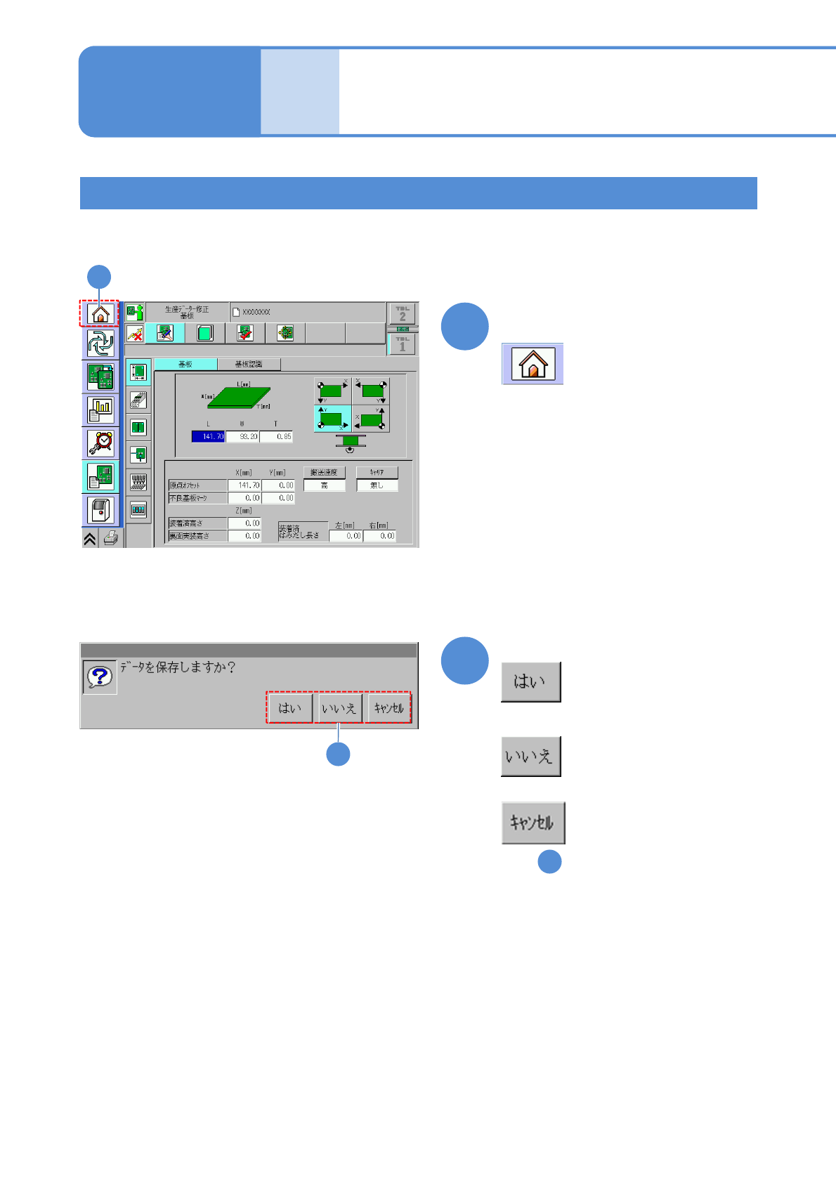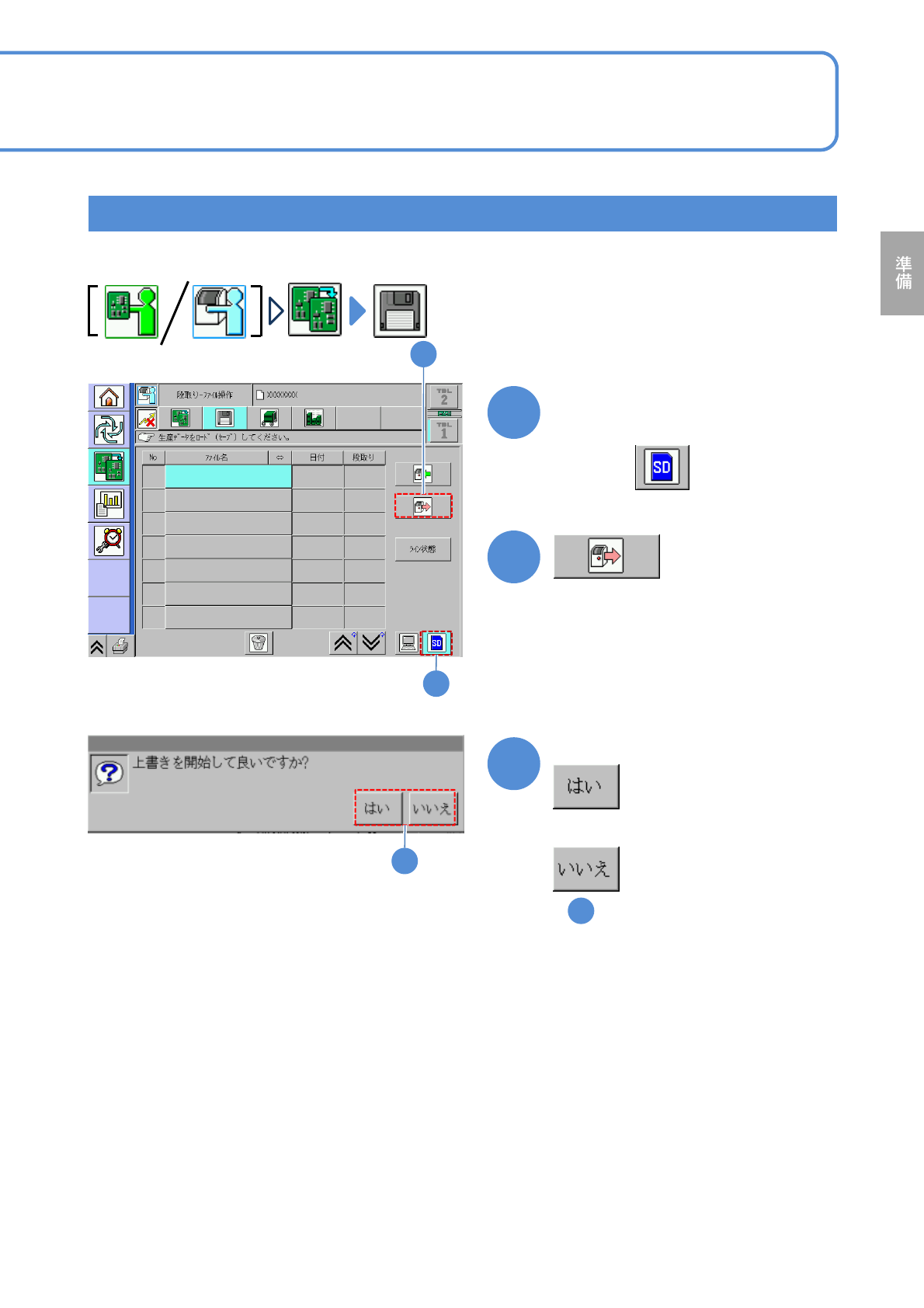 NPM-W 2 EJM7DJ-MB-02O-00 設備から SD カードに保存する 2-3-4 -2 2 3 2 メッセージを確認して LNB から設備に読み込んだ生産デー タを、設備でデータを修正して SD カードに保存する方法を説明し ます。 1 SD カード(パラメーターディス ク)が挿入されていることを 確認して ■データを保存しないとき ( の状態のまま) 2 1 3
