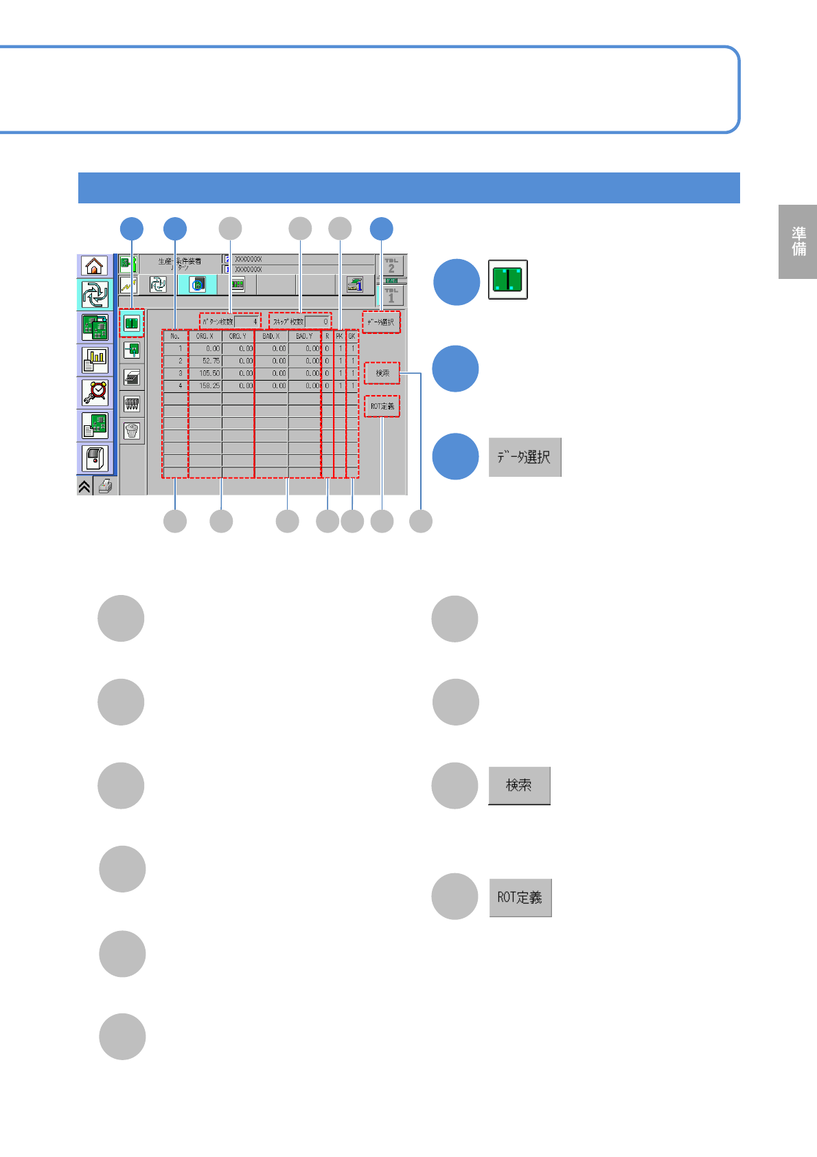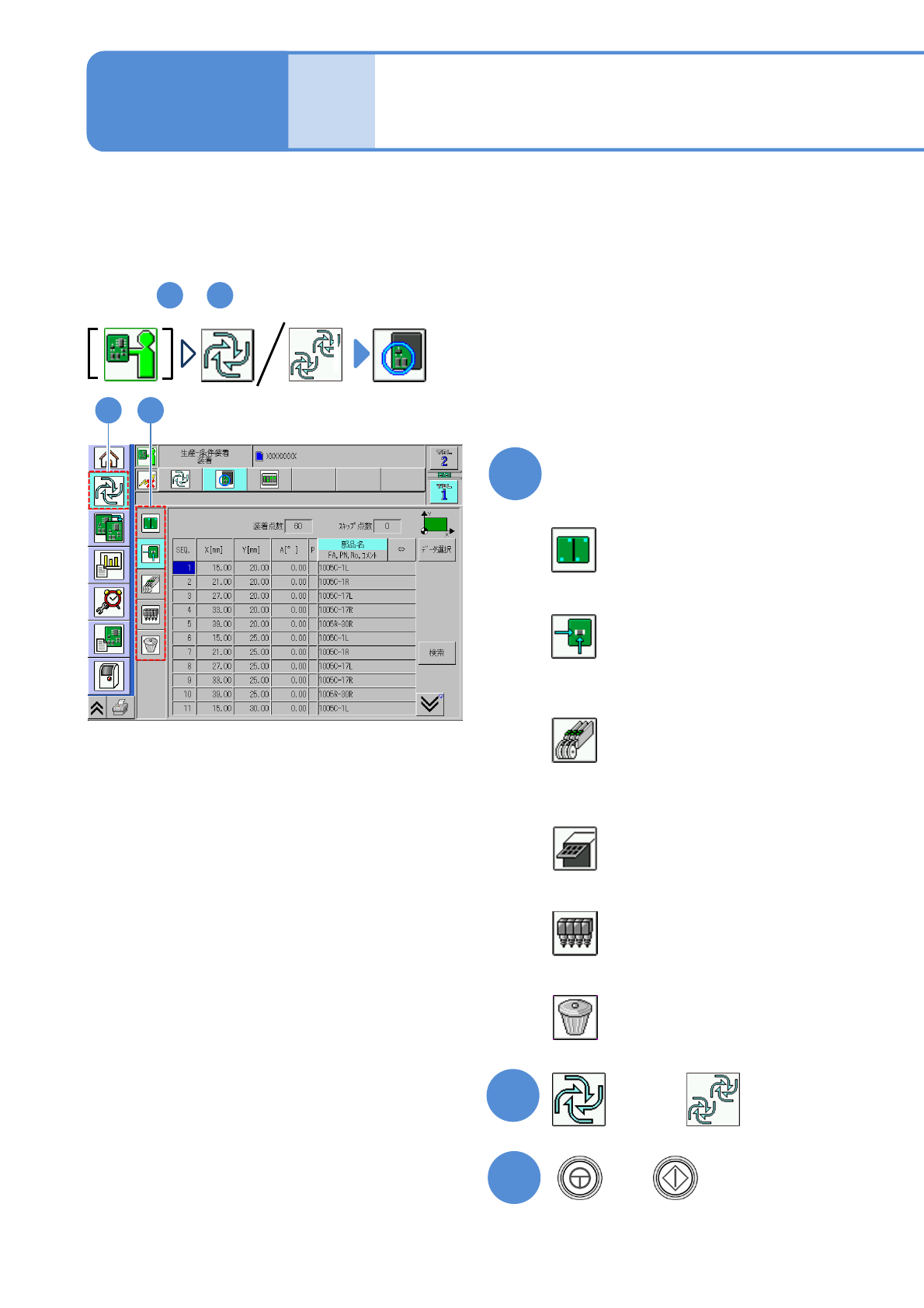 NPM-W 2 EJM7DJ-MB-02O-00 2 1 1 2 パターンを選ぶ ●複数選べる。 3 3 ●再度押すと、選択が解除される。 E F C D J 2-5-6 -2 A E F G B C D I J H パターン枚数 パターンの総枚数。 スキップ枚数 スキップ指定したパターン総枚数。 No. パターンの ID 番号。 ORG.X/ORG.Y 原点パターンの X/Y 座標 BAD.X/BAD.Y 不良パターンの X/Y 座標…