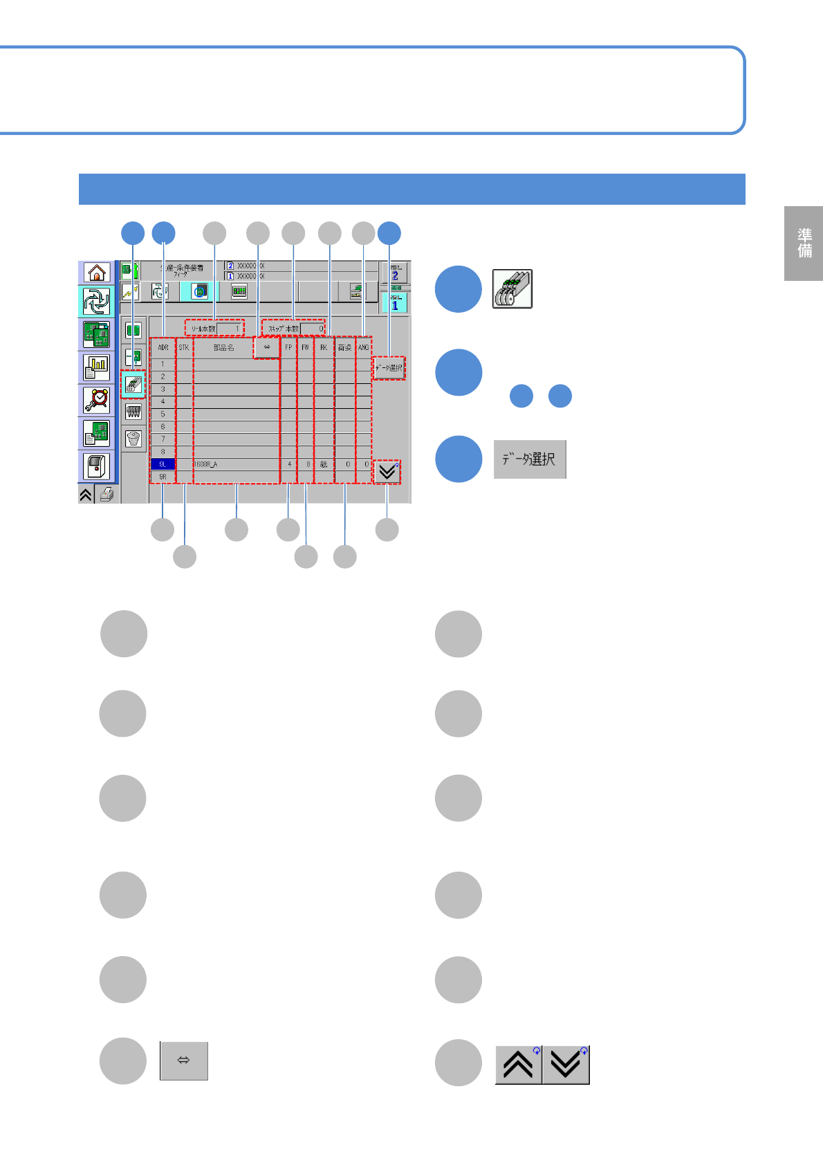 NPM-W 2 EJM7DJ-MB-02O-00 2 1 1 2 パターンを選ぶ A E F G B C D H l 3 K L J 2-5-6 -4 A B C H I J G K L 3 部品で指定する(インテリジェントフィーダー) D E F ● ~ を繰り返して複数選べ る。 2 3 ●再度押すと、選択が解除される。 リール本数 配置したフィーダーの本数。 スキップ本数 スキップ指定したフィーダーの本数。 ADR フィーダーを配…
