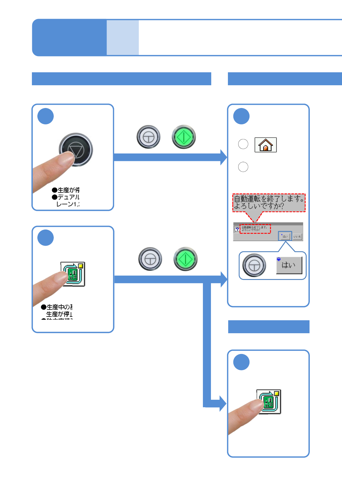 NPM-W 2 EJM7DJ-MB-03O-0 0 3-1-2 -2 ■自動のとき 3 ●上流側の信号を受けて最後の一枚を生産したら生 産終了し、 メインメニュー画面に戻る。 生産終了 1 ■設備の電源を落とすとき OFF SERVO 2 OFF