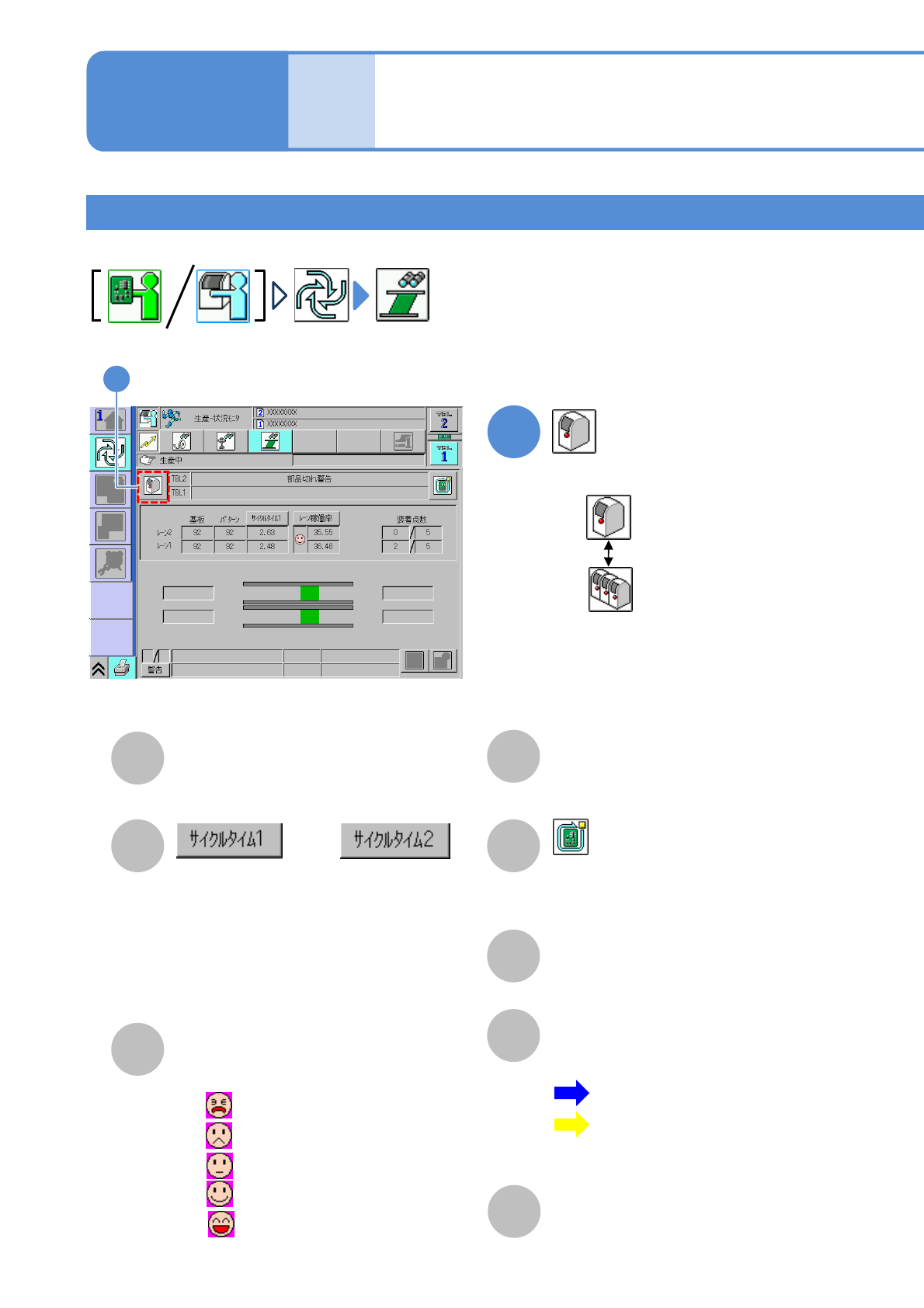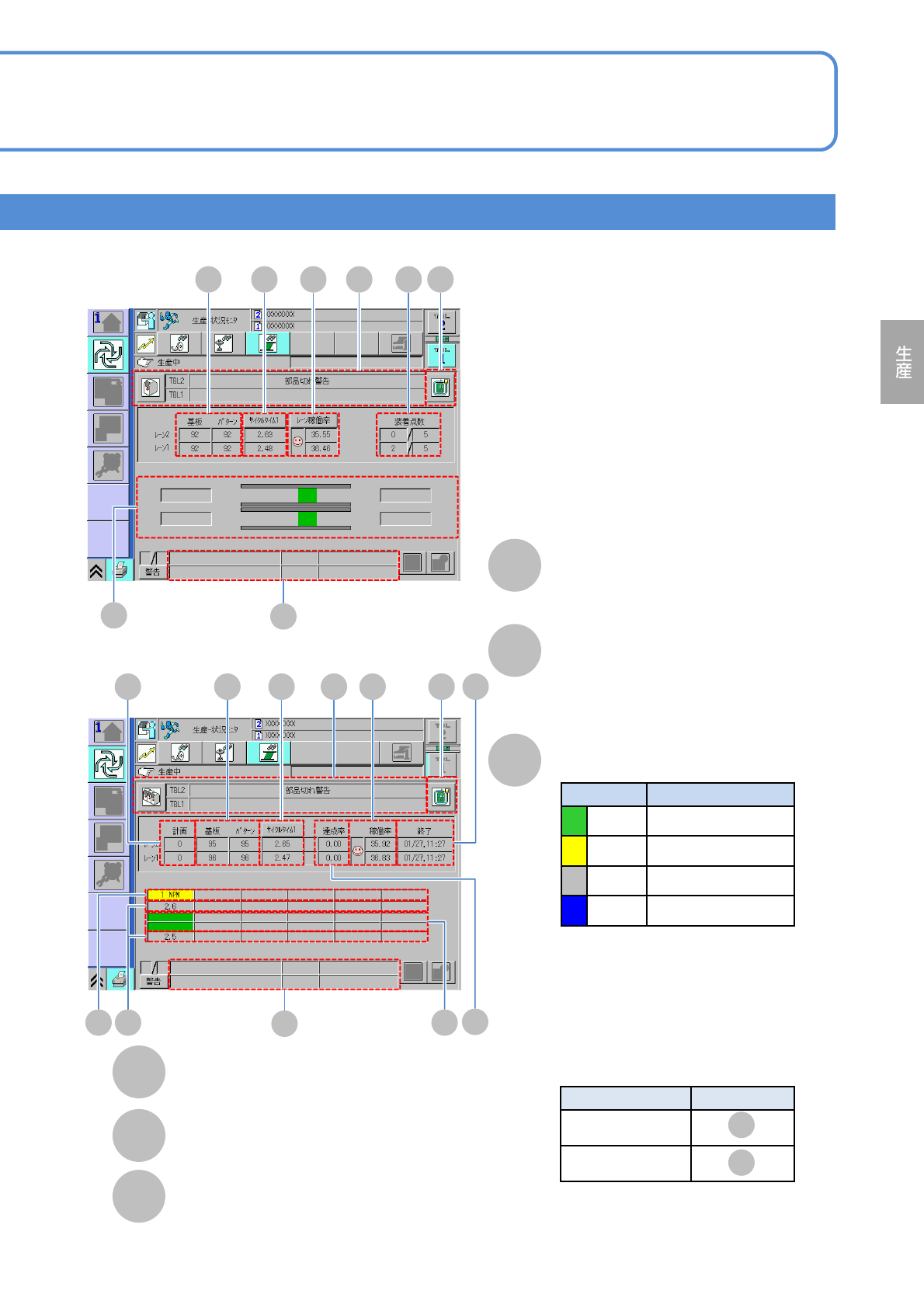 NPM-W 2 EJM7DJ-MB-03O-0 0 生産 情報 生産中・停止中の見方 1 生産中の画面 1 ●生産中に、生産情報や運転状況が表示されます。 3-2-1 -1 A E B C D F 生産枚数 生産した基板数 / パターン数。 1 枚の基板を生産するのにかかる時間の表 示を切り替える。 ( 押すごとに切り替わる ) ●サイクルタイム 1 実装前のクランプ完了から、実装完了 のクランプ解除までの時間。 ●サイクルタイム 2 …