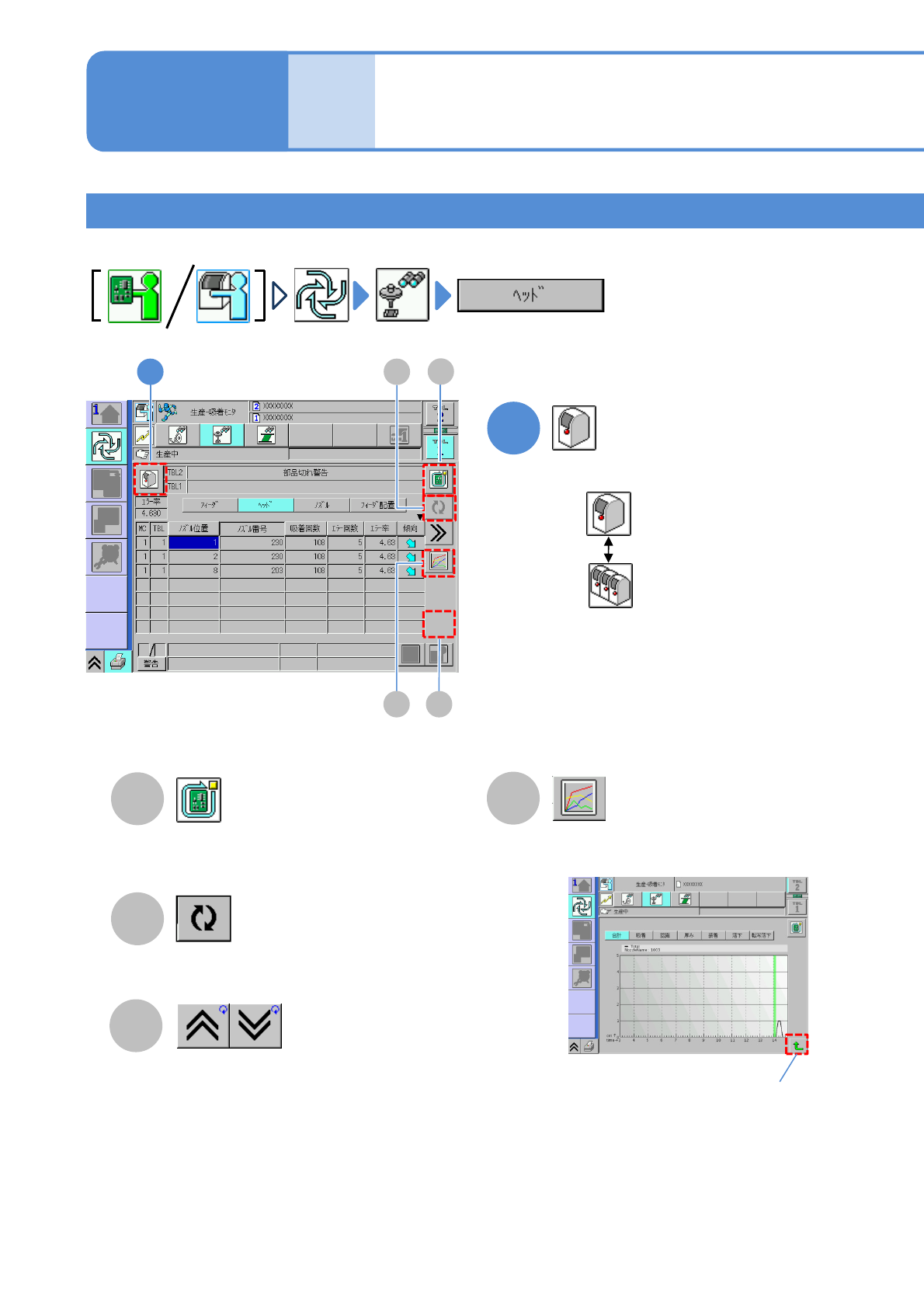 NPM-W 2 EJM7DJ-MB-03O-0 0 ヘッドの吸着状況 生産中・停止中の見方 5 3-2-1 -9 B D 生産 情報 A 生産中の基板を生産後、停止する。 ( → P.3-1-2) 最新の情報に更新される。 前後の表が表示される。 ●選択中のノズルの 1 時間当たりのエ ラー回数がグラフに表示される。 縦軸 : エラー回数 横軸 : 時間 元の画面に 戻るとき ●装着ヘッドの吸着状況が表示されます。 C A B D C …