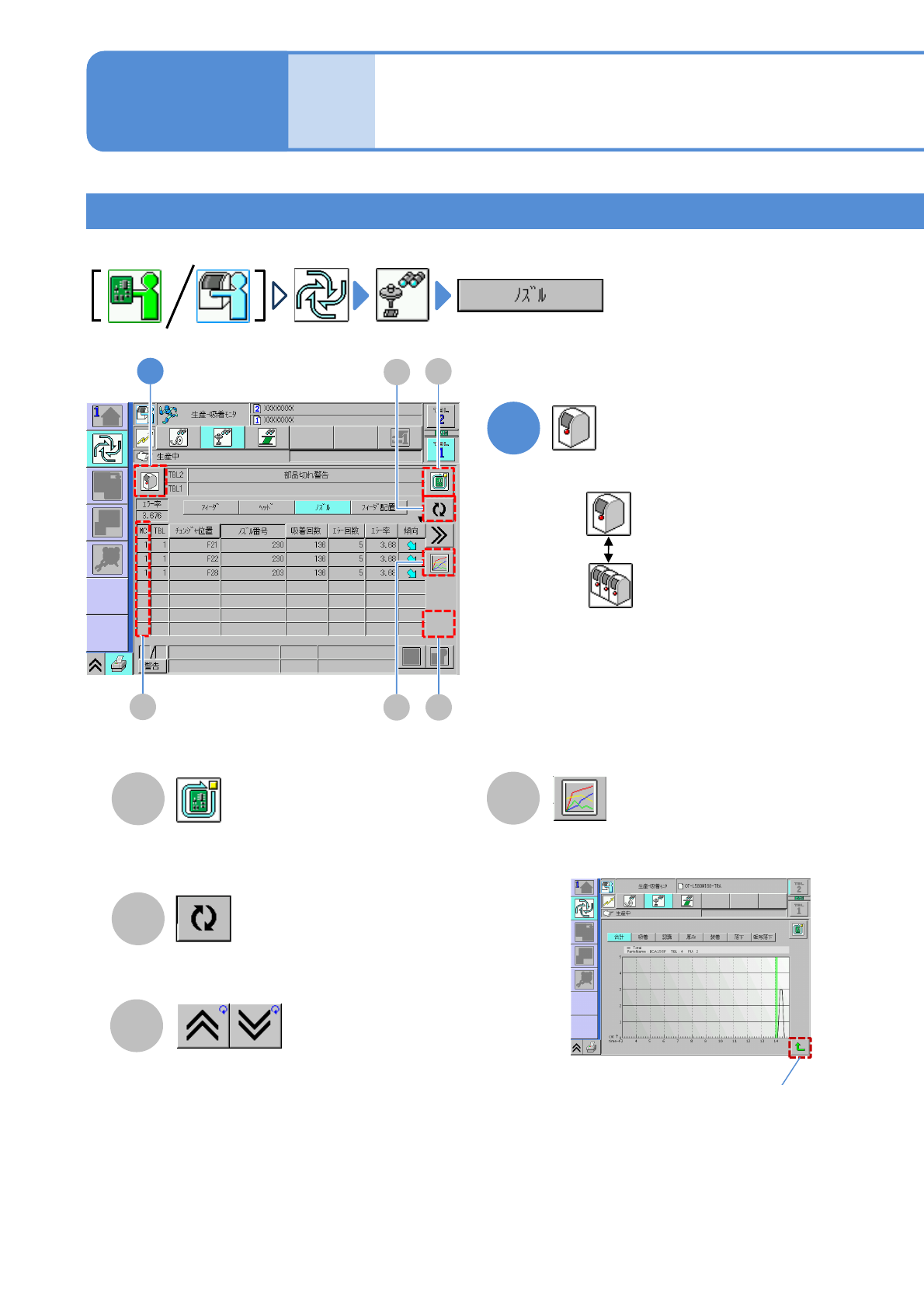 NPM-W 2 EJM7DJ-MB-03O-0 0 ノズルの吸着状況 生産中・停止中の見方 6 A C B D 3-2-1 -11 生産 情報 ●ノズルチェンジャー内のノズルの吸着状況が表示 されます。 生産中の基板を生産後、停止する。 ( → P.3-1-2) 最新の情報に更新される。 前後の表が表示される。 ●選択中のノズルの 1 時間当たりのエ ラー回数がグラフに表示される。 縦軸 : エラー回数 横軸 : 時間 元の画面に 戻る…