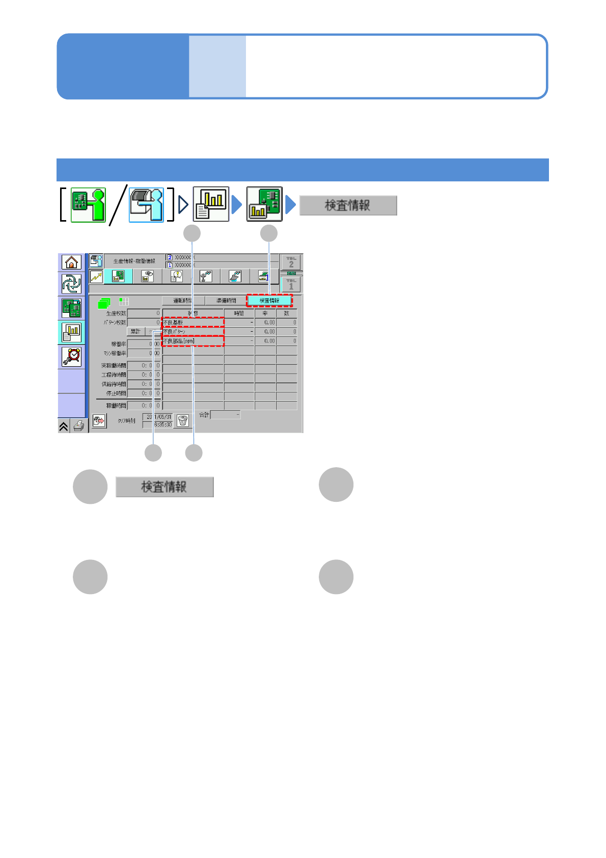 NPM-W 2 EJM7DJ-MB-03O-00 3-2-2 -3 稼働情報 2 C A D C A 表の項目を検査情報に関する項目に切り 替えます。 不良パターン ●率:不良パターン数/生産パターン数 ●数:不良パターン数 検査情報 ( 検査ヘッドのみ ) B B 不良基板 ●率:不良基板/生産基板数 ●数:不良基板数 D 不良部品 [ppm] ●率:不良部品数 /( 生産基板数×基板内 検査部品数 ) ●数:不良部品数 生産 情報 …
