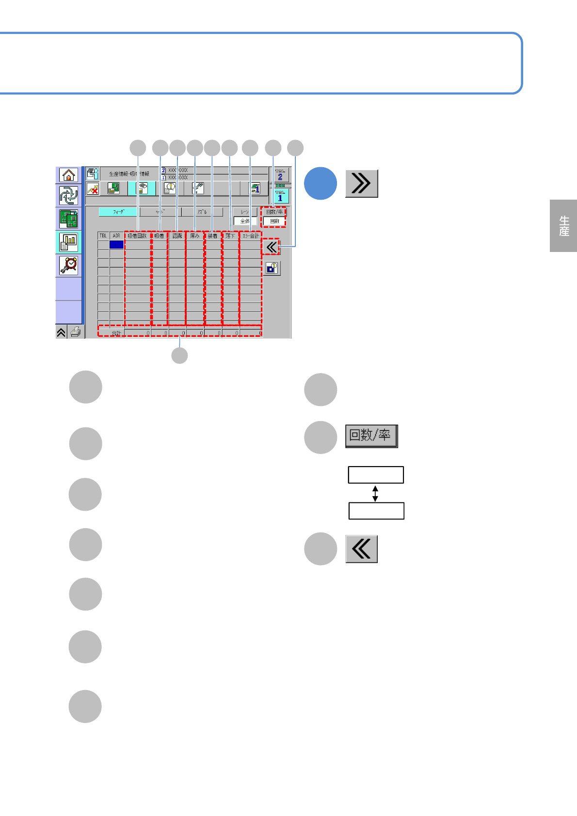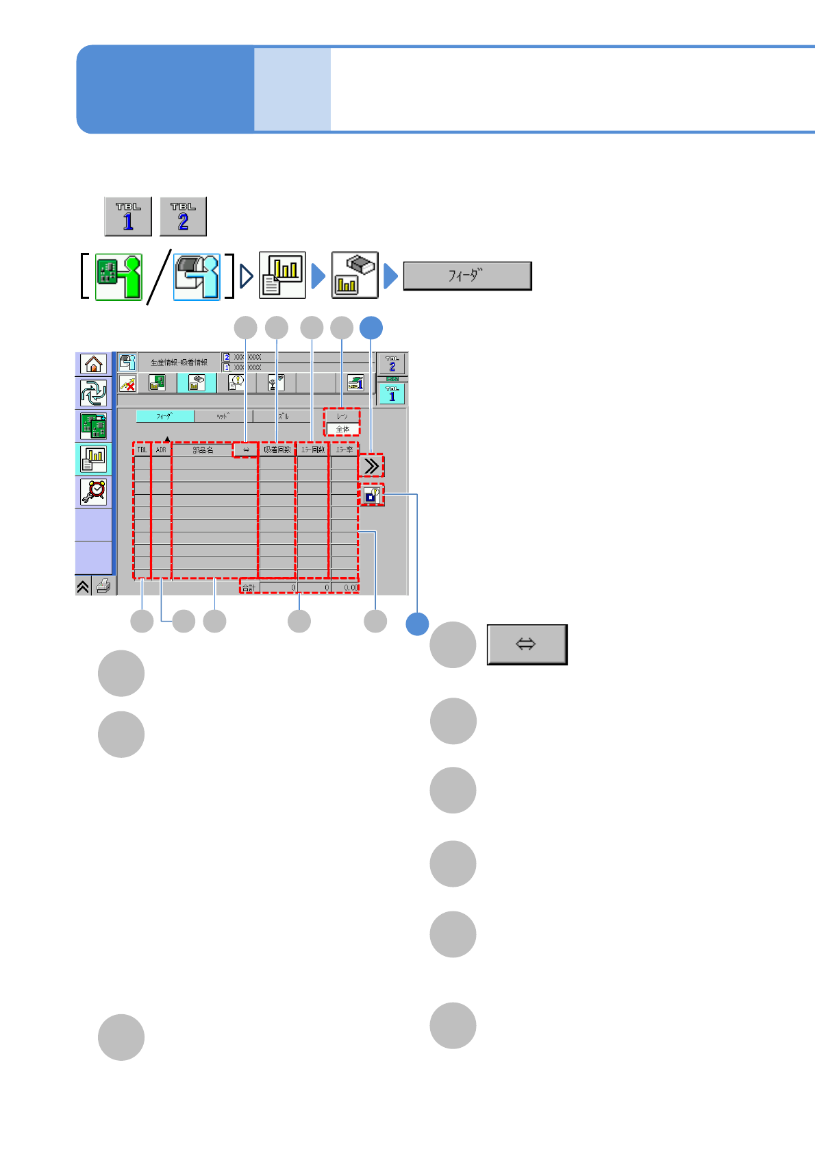 NPM-W 2 EJM7DJ-MB-03O-00 2 3-2-3 -1 C A B D E F G フィーダーの部品吸着情報をフィーダーアドレスご とに確認できます。 TBL( テーブル ) 参照しているテーブル。 ADR ( アドレス ) フィーダーアドレス。 部品名 吸着した部品名。 合計 全フィーダーの吸着回数とエラー回数 の合計、および全体の吸着回数に対す るエラーの発生率。 H E F D A C H B 長い部品名がスクロー…