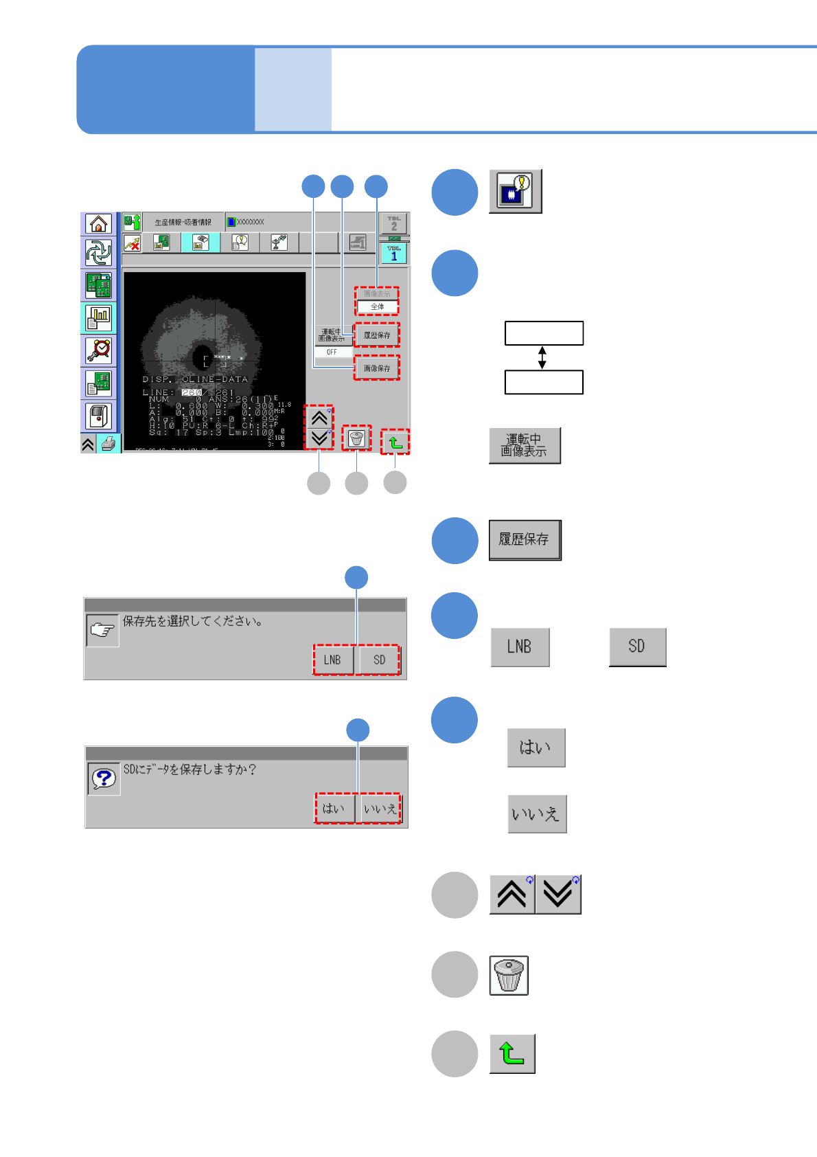 NPM-W 2 EJM7DJ-MB-03O-0 0 3-2-3 -4 7 ■確認するとき 8 ( 認識エラー画像が表示される ) ■保存するとき 9 10 11 メッセージを確認して または メッセージを確認して ■データを保存しないとき ■キャンセルするとき 12 10 11 8 9 12 ●エラー時の画像をノズルごとに確認 し、保存することができる。 ノズル位置を指定して