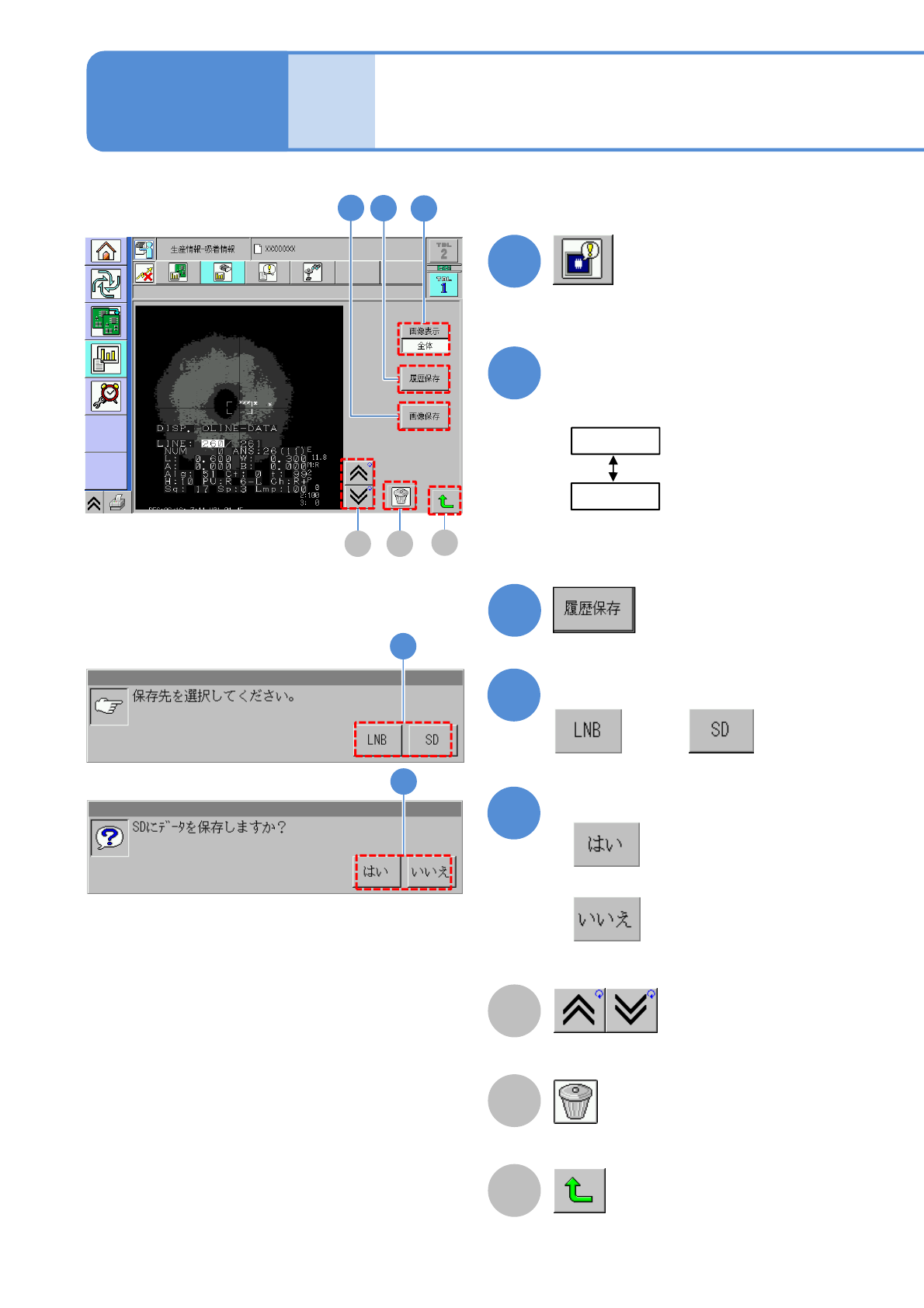 NPM-W 2 EJM7DJ-MB-03O-00 : すべての画像を表示。 : 前の画面で指定したヘッ ド番号の画像を表示。 3-2-4 -3 ヘッドの吸着情報 2 B C A 3 4 7 4 A B 画像が消去される。 前後の画像に切り替わる。 C 元の画面に戻る。 5 6 メッセージを確認して または メッセージを確認して ■データを保存しないとき 5 6 画像表示を選ぶ ●選択中のテーブルの全エラー画像が 最新の順に表示される。 …
