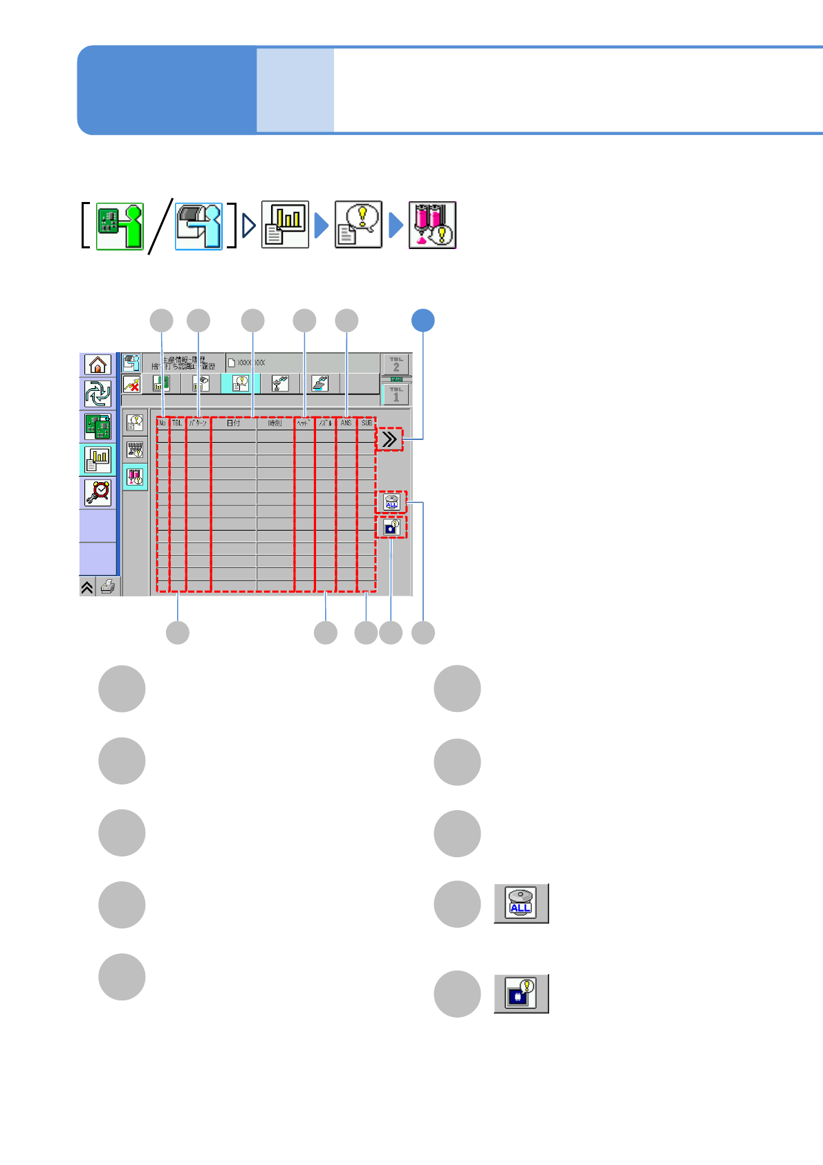 NPM-W 2 EJM7DJ-MB-03O-0 0 3-2-9 -2 A B C D 元の画面に戻る。 X [mm]/Y [mm] エラーが発生した座標。 E F ターン エラーが発生したときのフィ-ダ-と 基板間の往復回数。 PCB エラーが発生したターン内の装着順。 ●基板が 1 枚のとき 0 が表示される。 ●基板が 2 枚のとき 0: 先頭の基板 1: 後の基板。 判定値 真空エラー判定値。 (8 ビット階調表示 ) 実測値 真…
