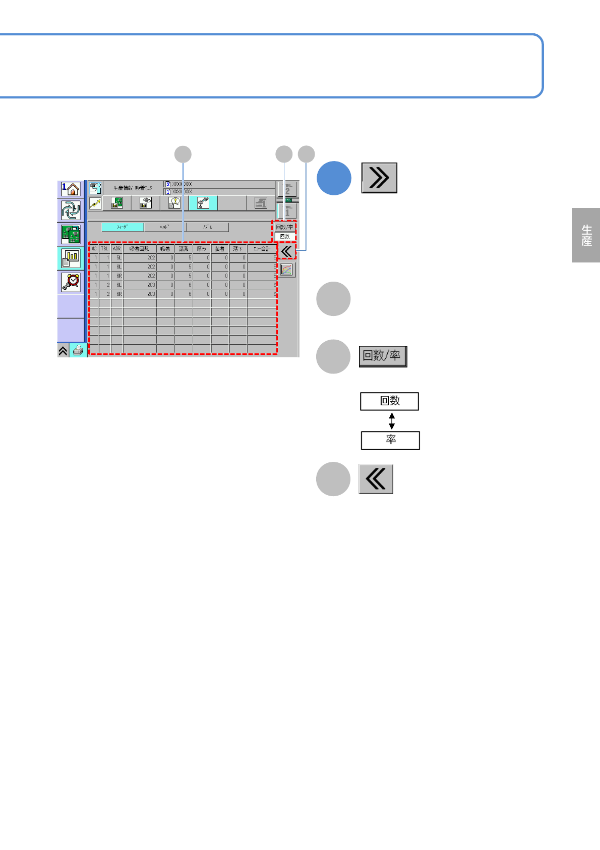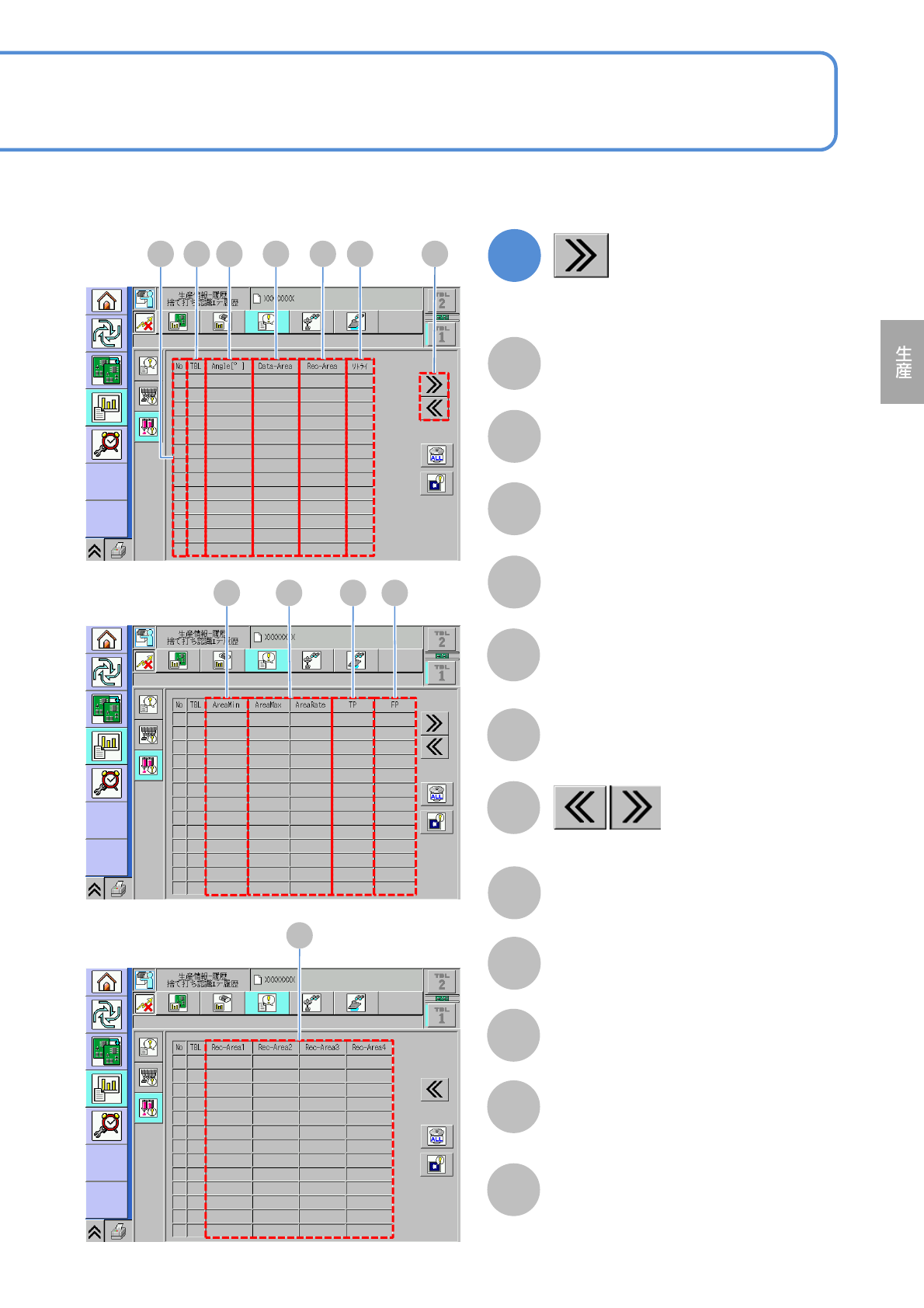 NPM-W 2 EJM7DJ-MB-03O-00 3-2-1 1 -1 1 フィーダーの部品情報をフィーダーアドレスごとに 確認できます。 A フィーダーごとの吸着情報 ( → P.3-2-1 -8 ) B 傾向 エラー率の増減傾向が表示される。 ● ● ● ● ● :超上昇傾向 :上昇傾向 :変わらない傾向 :超下降傾向 :下降傾向 前後の表が表示される。 C C A 2 B フィーダーの吸着モニター (部品のエラー回数のグラフが表示…
