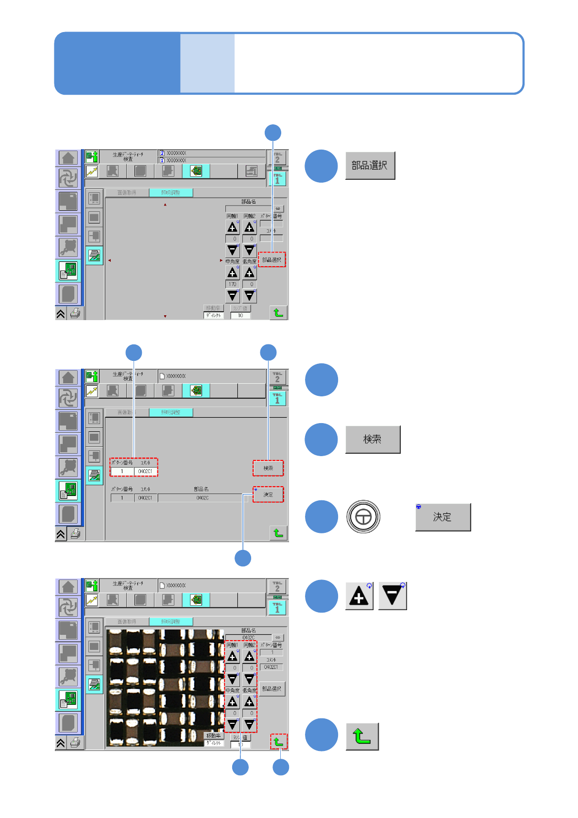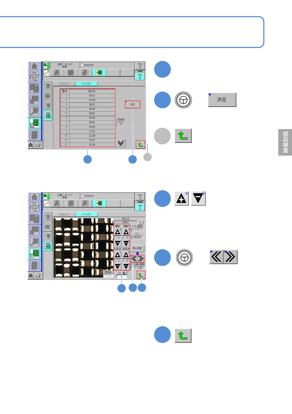 NPM-W 2 EJM7DJ-MB-04O-00 生産デー タと ティーチ ング ティーチング基板の撮像 4 操作編 4-3-2 4-3-2 -7 1 ■モードがコメントのとき 1 (画像状態を確認する部品を選ぶ画面が 表示される) 2 3 5 4 パターン番号とコメントを入力す る 2 3 (入力したデータと一致する部品情報が 画面に表示される) 4 + (選んだ部品位置に検査ヘッドが移動す る) 5 ●同軸 1 /同軸 2 /中角度…