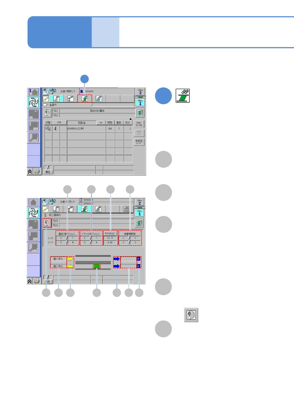 NPM-W 2 EJM7DJ-MB-04O-00 生産 4-4-2 -1 状況モニター 操作編 4-4-2 1 1 A 基板 NG 基板枚数/基板パスを含む基板通過 枚数。 B パターン NG パターン数/実際に検査したパタ- ン数。 C サイクルタイム サイクルタイム 1 : 装着前のクランプ完了時から装着終了 後クランプ解除前までの時間(秒)。 サイクルタイム 2 : 搬送時間を含み、基板待ち時間、基板 搬入時間を含む時間(秒)。 …