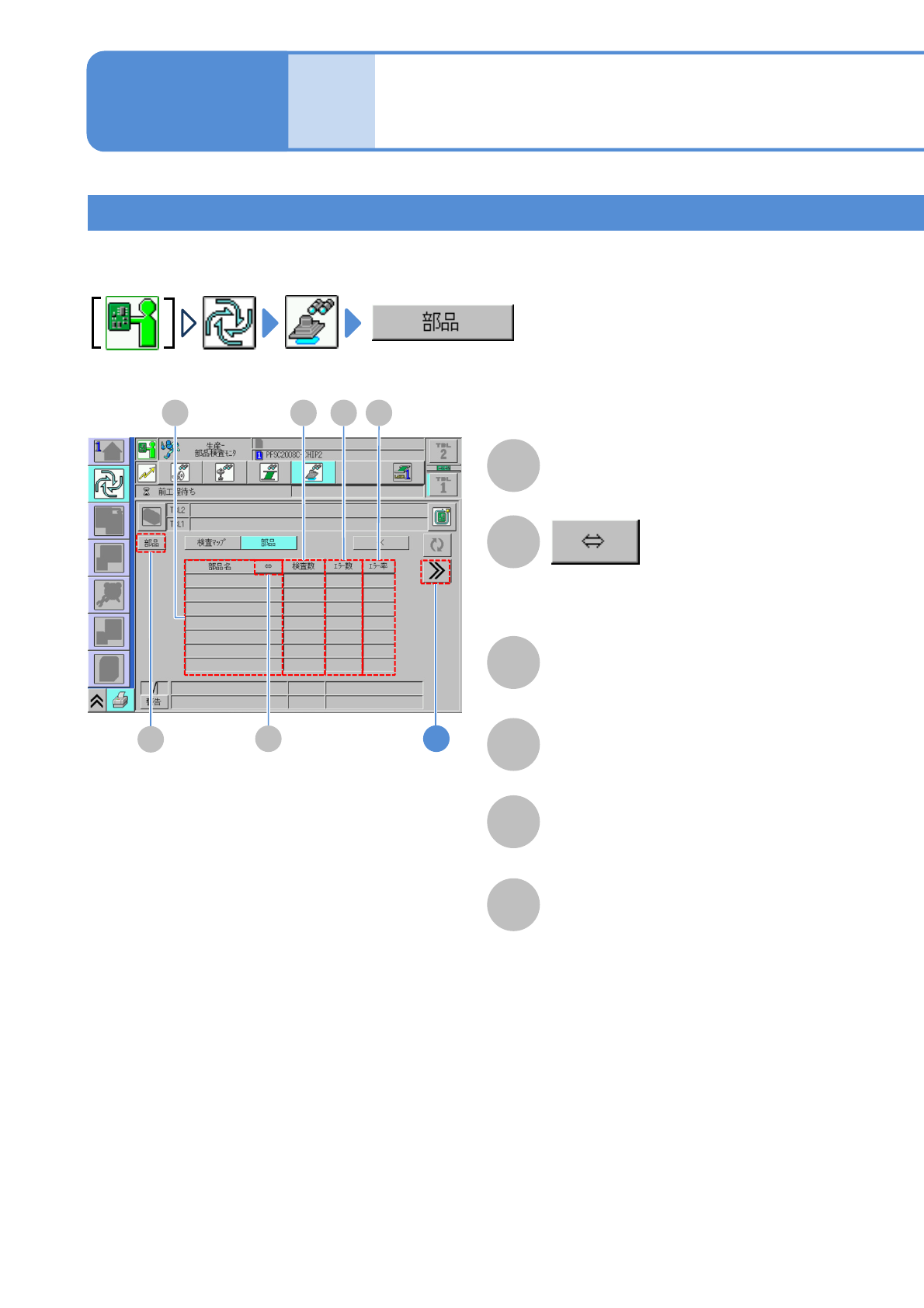 NPM-W 2 EJM7DJ-MB-04O-0 0 4-4-3 -6 A B E 異物 F 異部品 C 表裏 表裏反転検査エラー個数。 有無 異物検査エラー個数。 異部品検査エラー個数。 (現在未使用) 位置 D 極性 極性検査エラー個数。 B G その他 その他のエラー個数。 有無検査エラー個数。 位置ズレ検査エラー個数。 A C D E F G 元の画面に戻る。 1 ( 検査内容の詳細が表示される ) H H