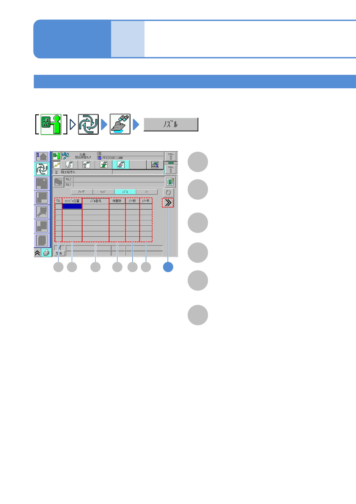 NPM-W 2 EJM7DJ-MB-04O-00 A TBL( テーブル ) B チェンジャー位置 ノズルチェンジャー内のノズルの位置。 不良が特定のノズルに集中したときなどに、不良判 定した部品をノズルごとに確認し て不良要因の特定や対 策するために使用します。 A C 4-4-3 -11 B D E F E エラー数 F エラー率 D 検査数 検査結果が不良の部品数。 (エラー数 / 検査数) × 100 (%) C ノズル番号 1…