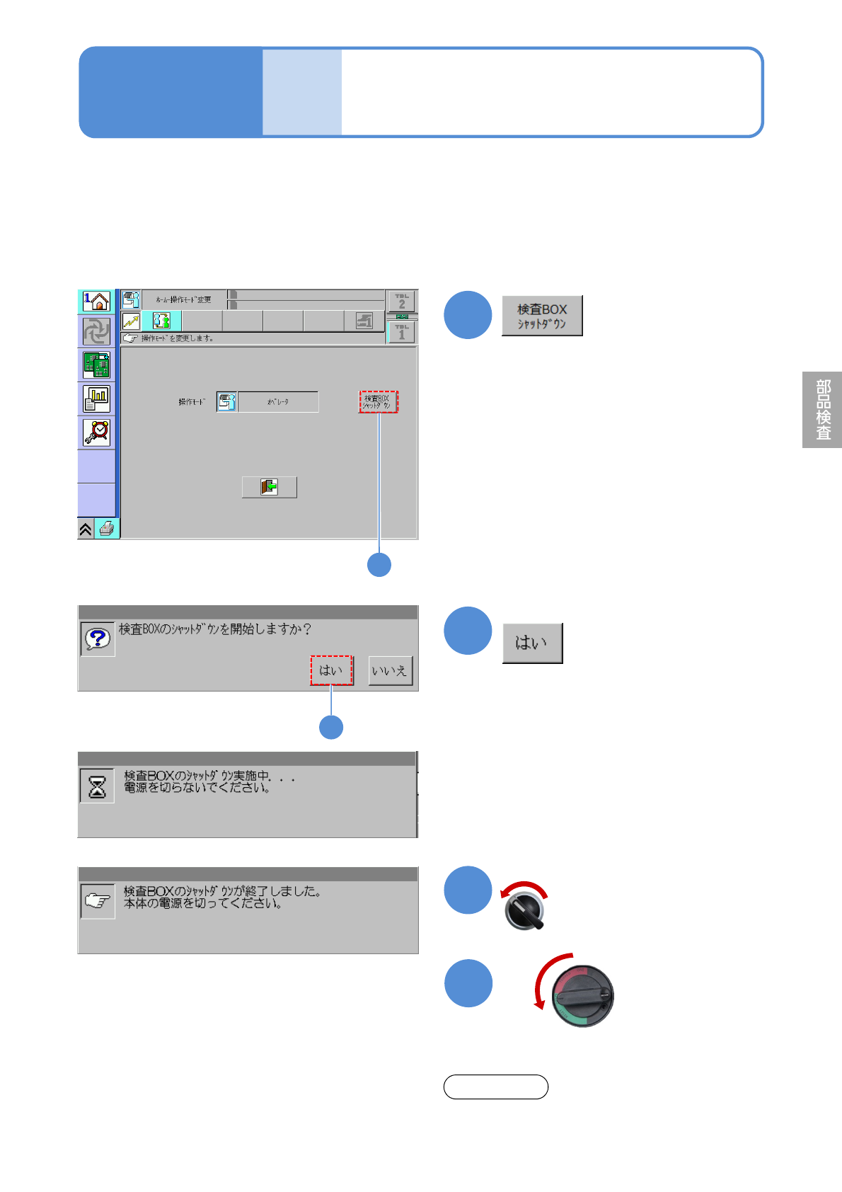 検査ヘッドを搭載した設備に検査BOX(パソコンやUPS)が接続されています。必ず検査BOXをシャットダウ