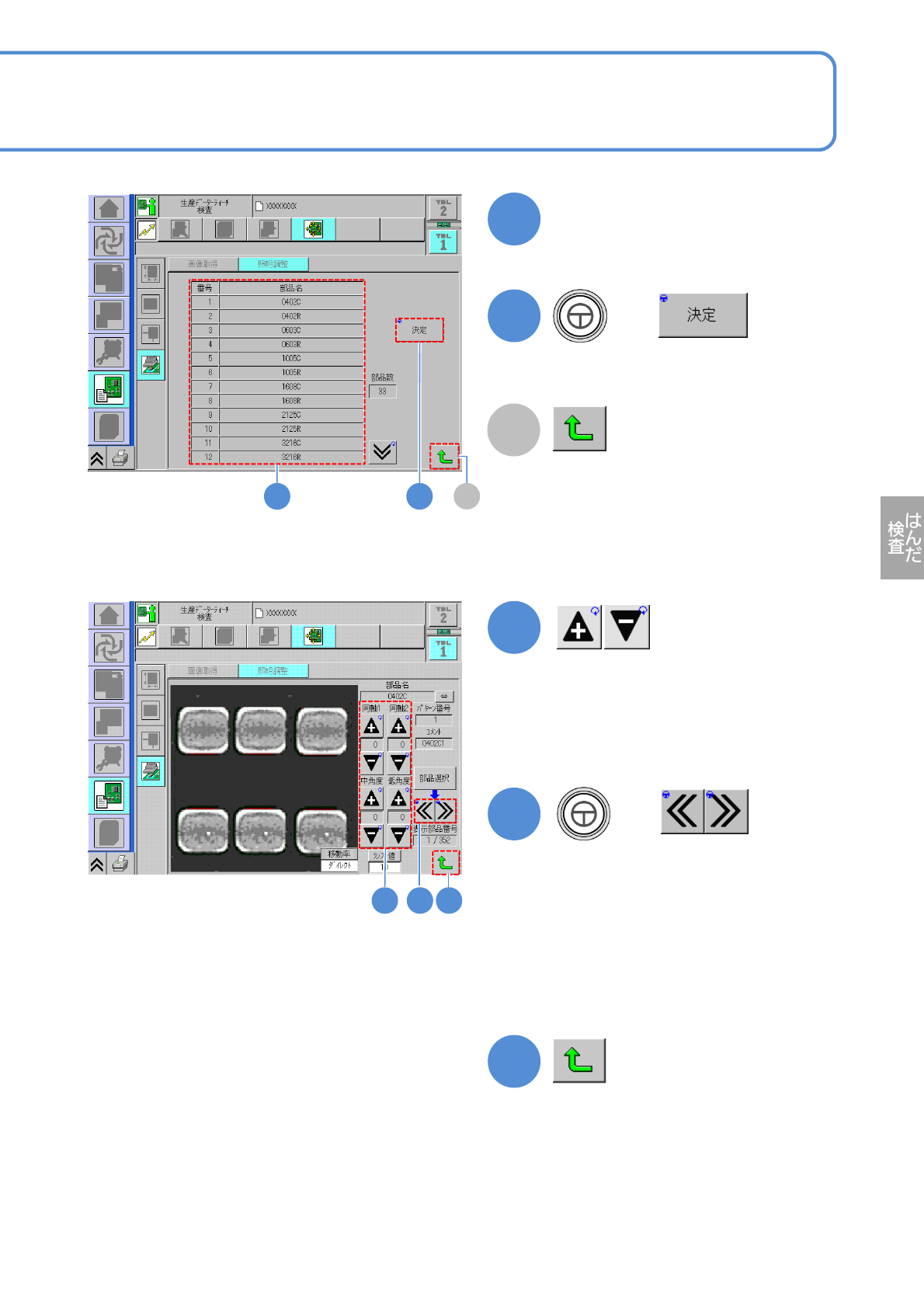 NPM-W 2 EJM7DJ-MB-05O-00 5-3-2 -6 2 A 3 4 部品名を選ぶ 2 3 + (選んだ部品位置に、検査ヘッドが移動 する) A (はじめの画面に戻る) 4 ●同軸 1 /同軸 2 /中角度/低角度の 各 照明値を変更し、検査に適した画像の 状態にする。 5 + (同じ部品名の他の部品に検査ヘッドが 移動する) ●他のはんだでも画像を確認したいとき に使用する。 ●各照明値を変更し、検査に適した状態 を画面…