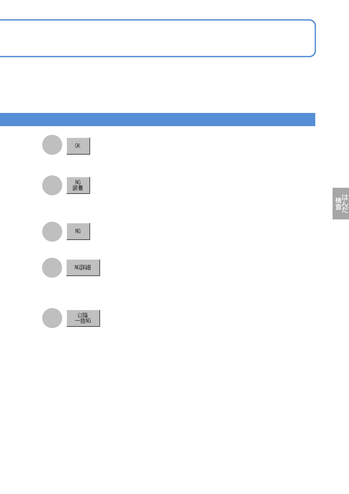 NPM-W 2 EJM7DJ-MB-05O-00 生産 5-4-4- 3 過判定入力画面 2 操作編 5-4-4 過判定入力する A E B コメント C パターン番号 G 前の画面に戻る。 計測値 不良項目ごとの計測値。 かすれ率 NG :面積率 [%] にじみ率 NG :面積率 [%] ブリッジ NG :ブリッジ幅 [mm] ずれ量X NG :ずれX [mm] ずれ量Y NG :ずれY [mm] 形状異常 NG :異形率 [%] G…