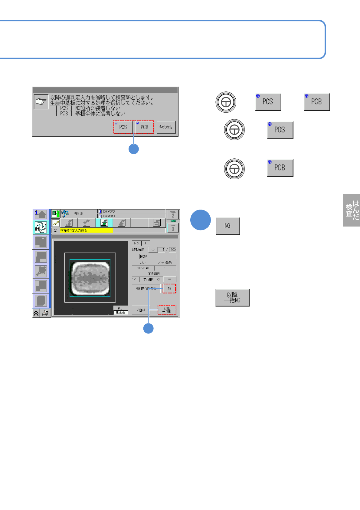 NPM-W 2 EJM7DJ-MB-05O-0 0 5-4-4 -6 ■不良判定の個数 ≥ 100 のとき 1 2 ■はんだごとに判定するとき 1 (部品は装着されない) ● 100 件を超えたはんだにつ いても検 査は実施されている。 ■一括で判定するとき (一括で、未入力の部品が装着されな い) ● 100 件を超えたはんだにつ いても検 査は実施されている。 または + ■装着前にはんだ検査するとき ● はんだ検査条件設定に沿って…