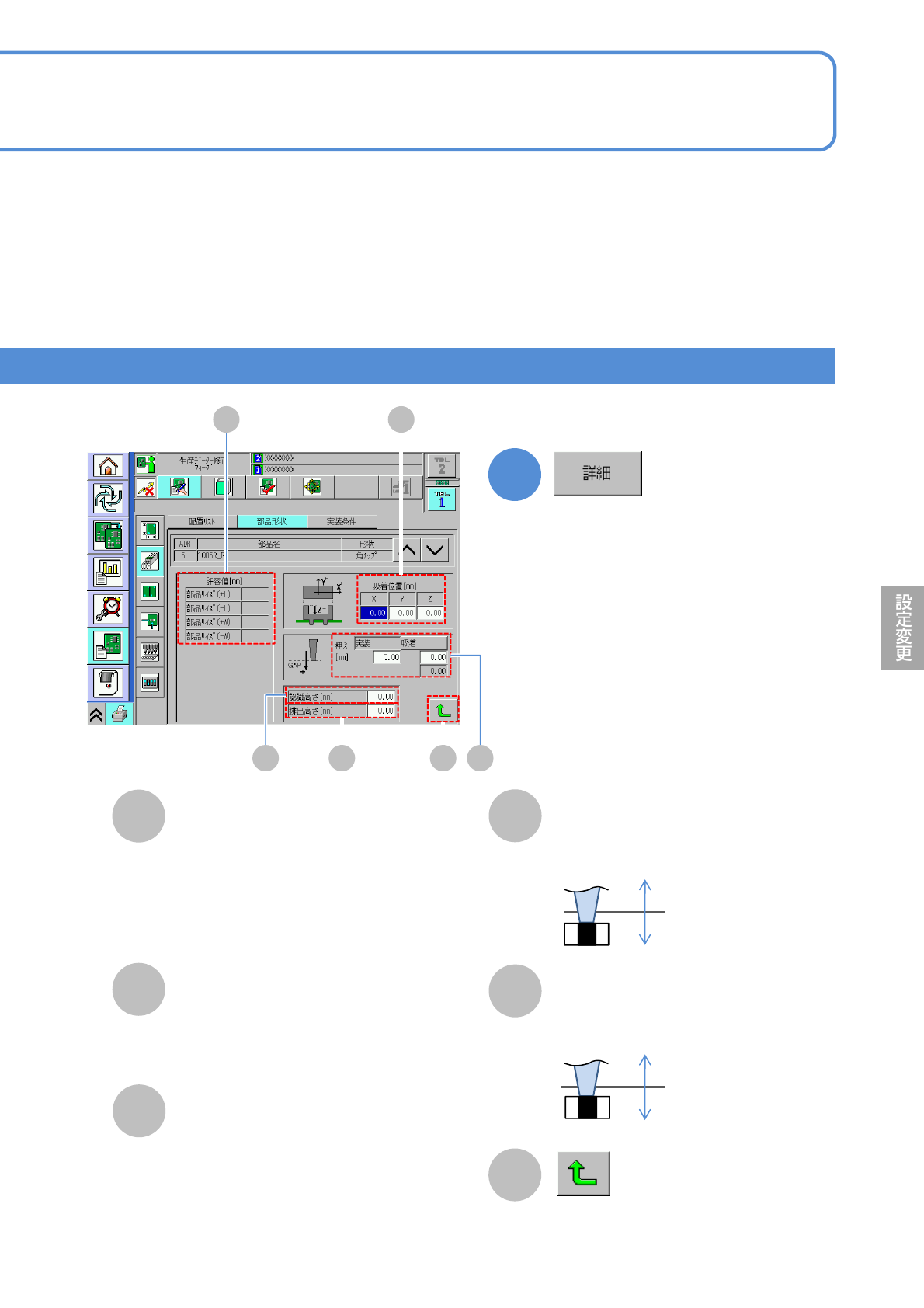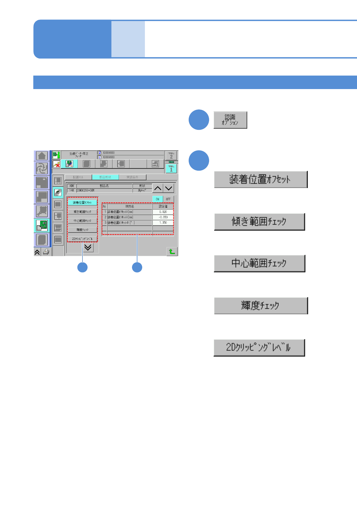NPM-W 2 EJM7DJ-MB-06O-00 6-1-8 -3 データ 修正 部品形状データの修正 2 操作編 6-1-8 4 確認する項目を選ぶ 5 4 ● 2D クリッピングレベルデータ を選んで、関連するデータを 表示する。 ●装着位置オフセットデータを選ん で、関連するデータを表示する。 ●傾き範囲確認データを選んで、 関連するデータを表示する。 ●中心範囲確認データを選んで、 関連するデータを表示する。 ●輝度確認データを…