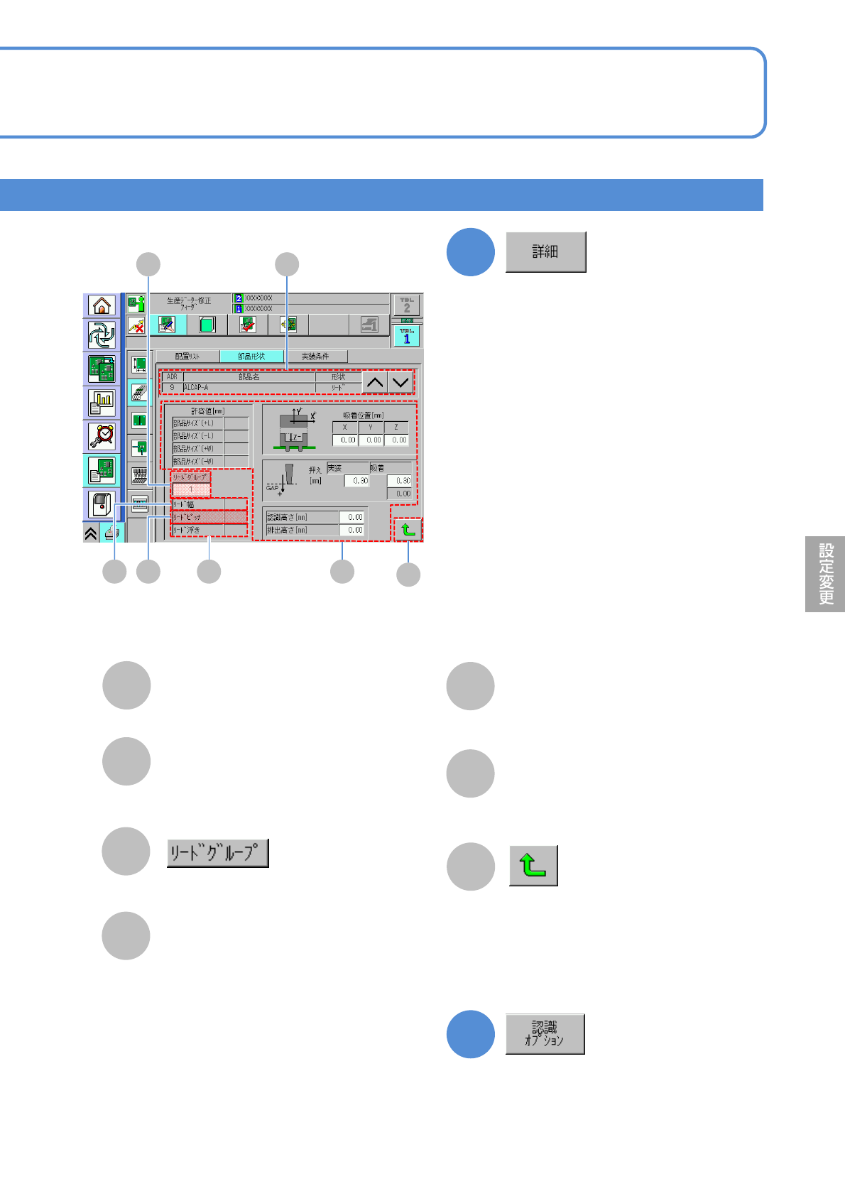 NPM-W 2 EJM7DJ-MB-06O-00 6-1-8 -7 A B F E D G C C A B 部品名 リード本数 辺 それぞれの辺のリード数。 確認する部品の辺を選ぶ。 D リード情報 それぞれの部品のリードの有無。 F G H H 元の画面に戻る。 データ 修正 部品形状データの修正 4 リード付き部品 2 E “リード抜け”位置を設定する画面を 表示する。 “ノイズ”位置を設定する画面を表示 する。 “リード有り”位置…