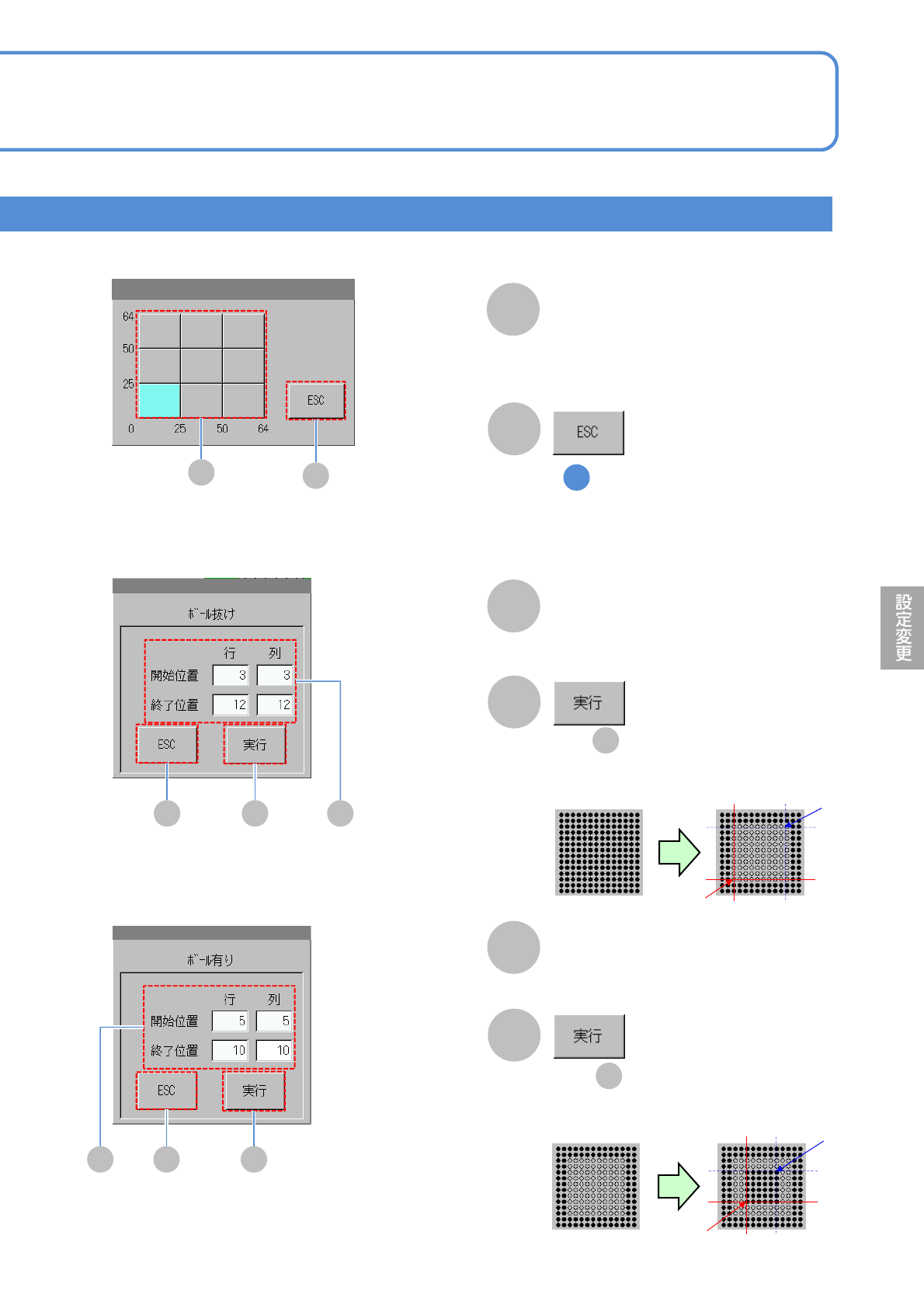 NPM-W 2 EJM7DJ-MB-06O-00 C B F 座標の表示範囲を設定する画面を表示 する。 F D 選択中の千鳥の有無を選ぶ。 選択中のボール位置のボール抜けの設 定を元に戻す。 E ボール有り位置を設定する画面を表示 する。 G D C E ボール抜け位置を設定する画面を表示 する。 B 座標図 G 部品のボール抜け情報。 ● : ボールあり。 ○ : ボールなし。 A 部品名 H 元の画面に戻る。 H A BGA 2 …