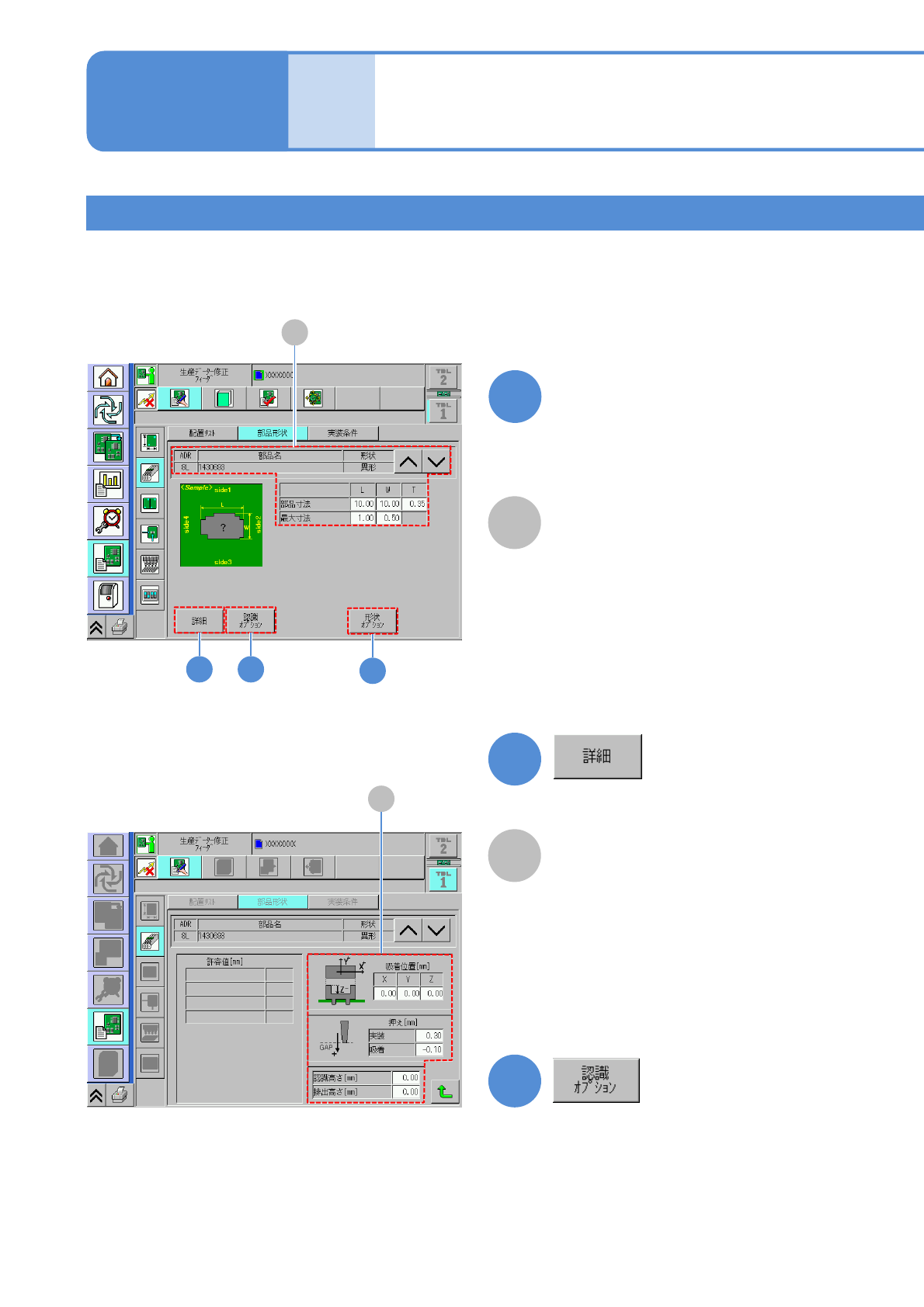NPM-W 2 EJM7DJ-MB-06O-00 異型部品 1 データ 修正 部品形状データの修正 7 A 2 3 A 部品情報 ( → P.6-1-8 -1 ) 4 6-1-8 -13 画面上の必要な箇所のデータを 修正する ●画面に触れると、入力画面が表示さ れる。 1 2 3 A 認識高さ、押え情報 ( → P.6-1-8 -2 ) 操作編 6-1-8 認識オプションデータの確認、修正を 行う。 ( → P.6-1-8 -3 ) …