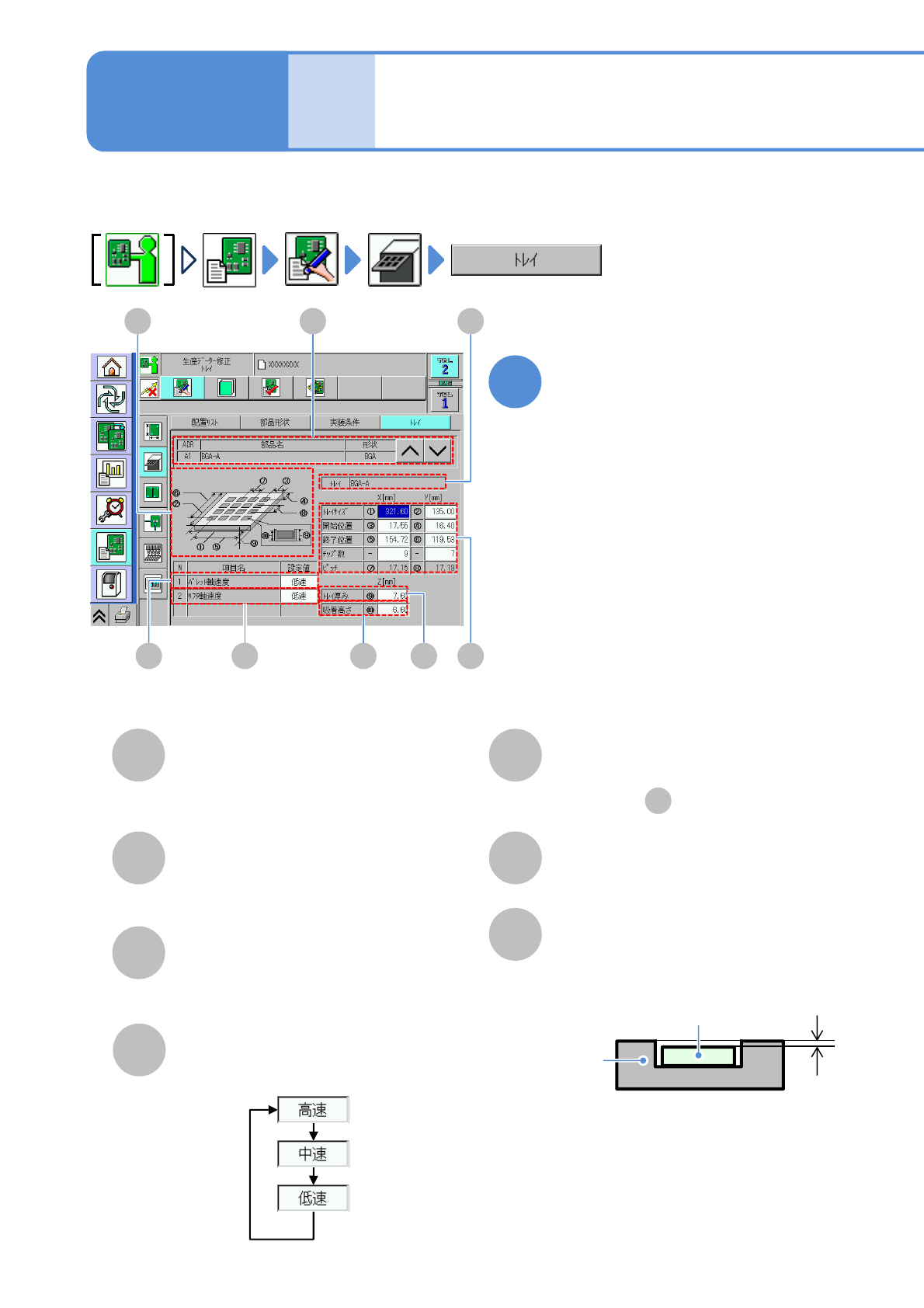 NPM-W 2 EJM7DJ-MB-06O-00 トレイサイズ H 開始位置 チップ数 ピッチ ■ 拡大図 C K L H I J トレイの外形寸法を入力する。 X :長い方の辺の寸法。 Y :短い方の辺の寸法。 I 第1吸着点の座標。 J 終了位置 最終吸着点の座標。 K X :長い方の辺に収納され た部品の個数。 Y :短い方の辺に収納され た部品の個数。 ●単位:個。 L 部品間のピッチ。 6-1-10 -2