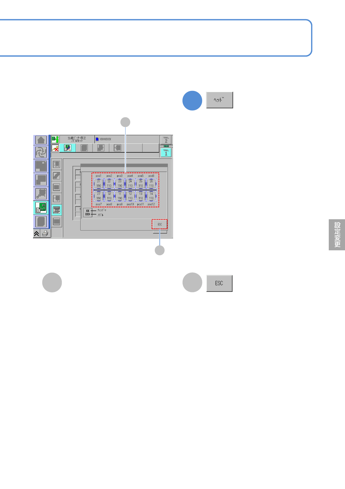 NPM-W 2 EJM7DJ-MB-06O-00 D C C ノズル配置データ D 元の画面に戻る。 ノズルポジションごとに使用するノズ ル番号とノズルチェンジャーの位置を 表示。 1 6-1-1 1 -2 ノズルポジションごとに使用するノズ ル番号とノズルチェンジャーの位置が 表示される