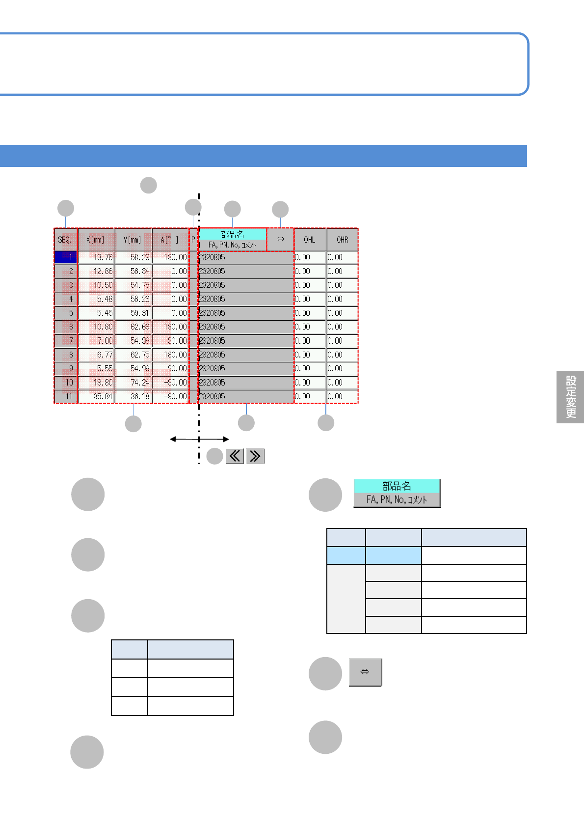 NPM-W 2 EJM7DJ-MB-06O-00 N M K 6-1-13 -2 I J OHL / OHR OHL :基板の左端からのはみ出し長さ。 OHR :基板の右端からのはみ出し長さ。 ●入力範囲: 0 ~ 9m m 。 ■生産データ情報 の一覧 E K J I O L M N 固定表示情報 による可変表示情報 O C SEQ. 装着点のシーケンス No. 。 X[mm],Y[mm] , A[ ° ] 装着点の座標と角度。 P …