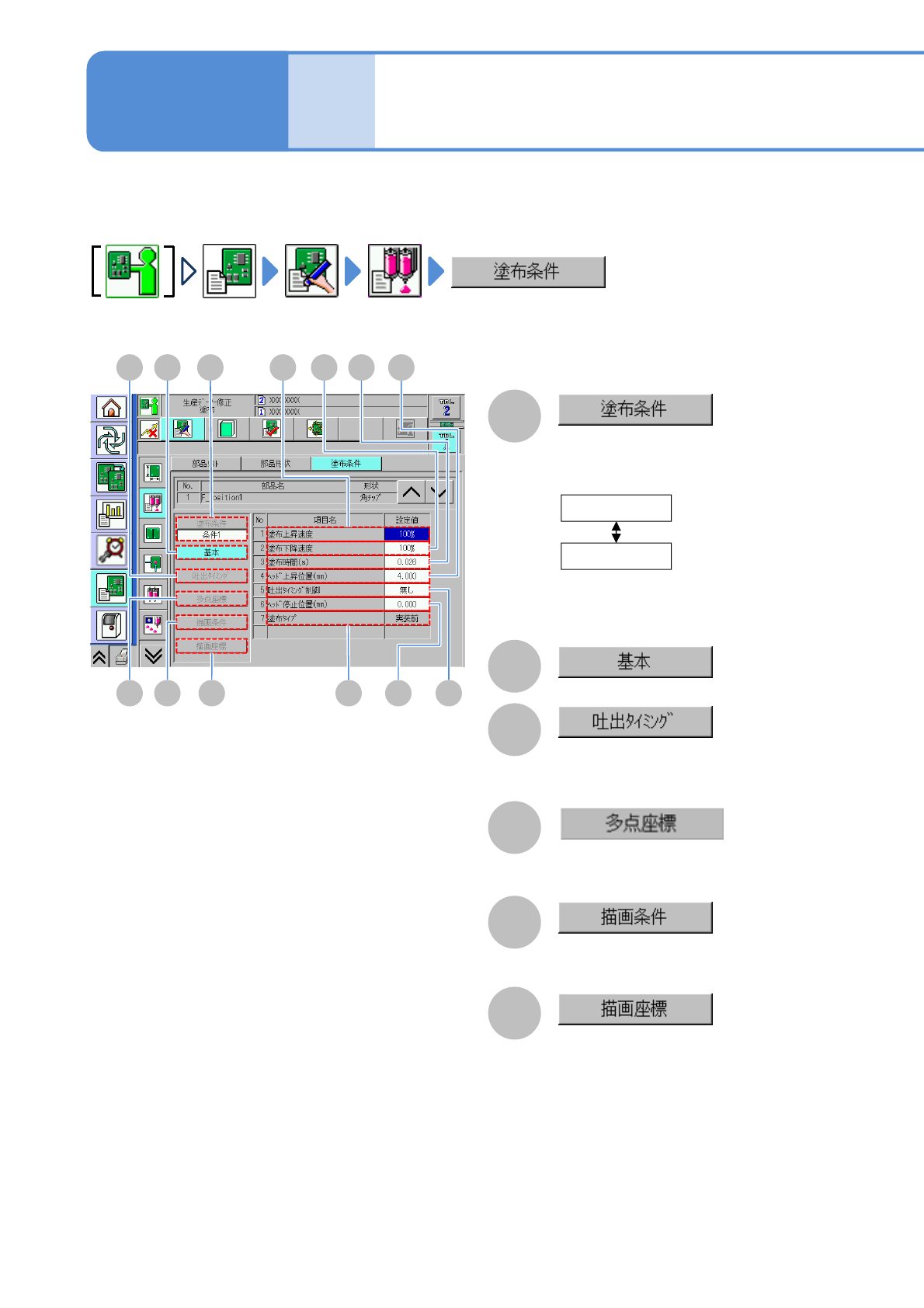 接着剤を基板上へ塗布するための動作条件を表示、設定します。