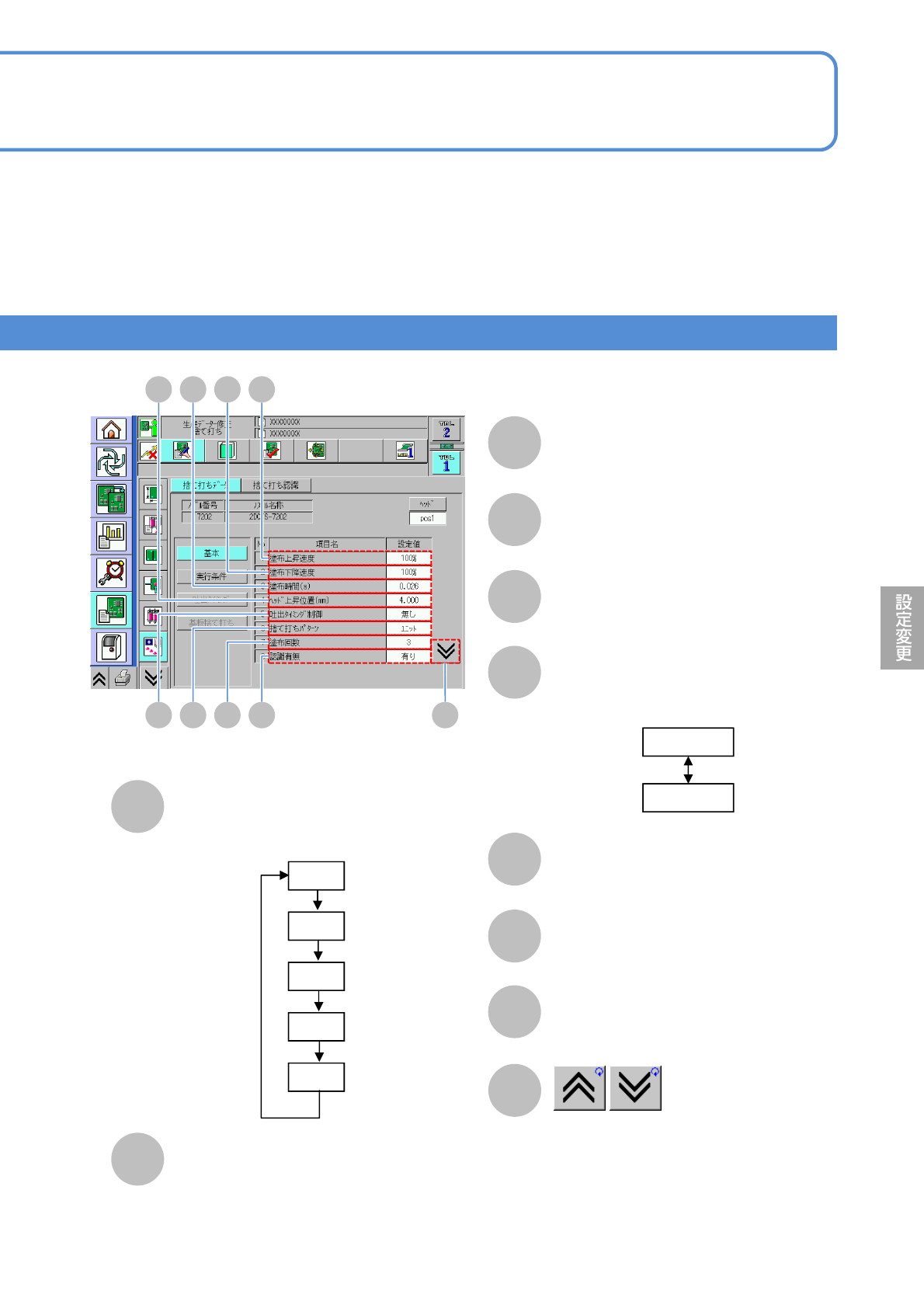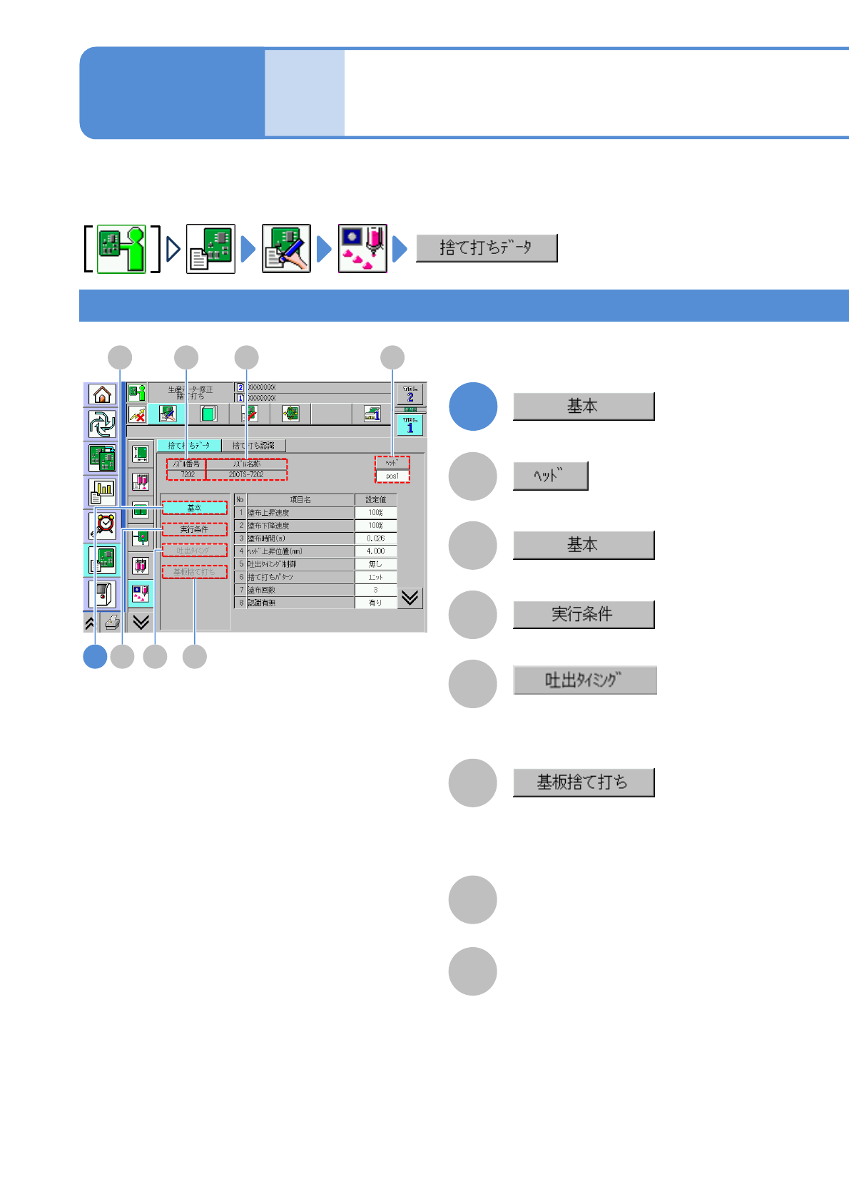 NPM-W 2 EJM7DJ-MB-06O-00 E C D 6-1-18 -1 F A データ 修正 捨て打ちデータの修正 1 (塗布ヘッド) 操作編 6-1-18 捨て打ち動作を行う場合の各種データを設定します 。 該当ノズルポジションの捨て打ちデー タを表示。 B 基本条件の設定項目を表示。 C 実行条件の設定項目を表示。 D 吐出タイミング条件の設定項目を表 示。 吐出タイミング制御が「有り」の場合 のみ、押下可能です。 E 基…