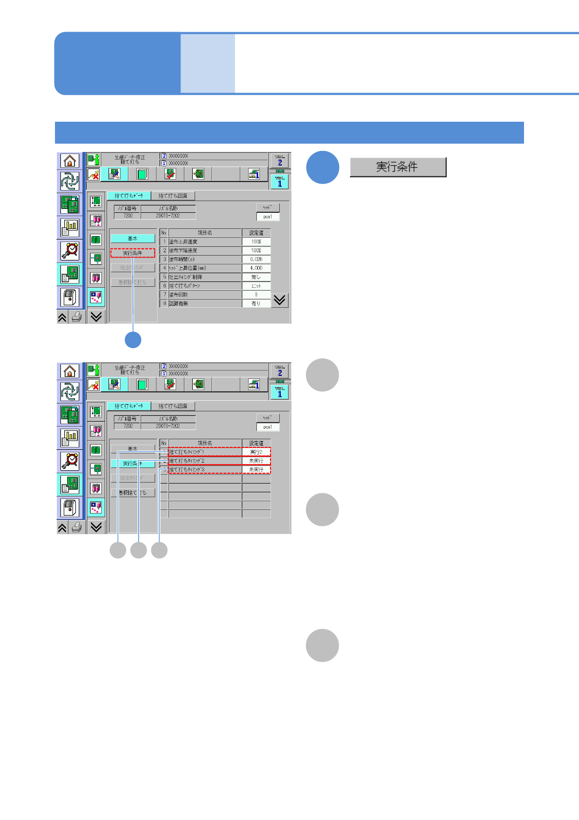 NPM-W 2 EJM7DJ-MB-06O-00 A 6-1-18 -3 A データ 修正 捨て打ちデータの修正 2 (塗布ヘッド) 捨て打ちタイミング 1 操作編 6-1-18 1 回目のノズル選択時の捨て打ちタイミ ングを表示。 未実行: 捨て打ちを実施しません。 実行 1 : 捨て打ちを実施します。 実行 2 : 捨て打ちおよび捨て打ち認識を実施 します。 実行条件設定 1 1 B C B 捨て打ちタイミング 2 2 回目以降のノ…