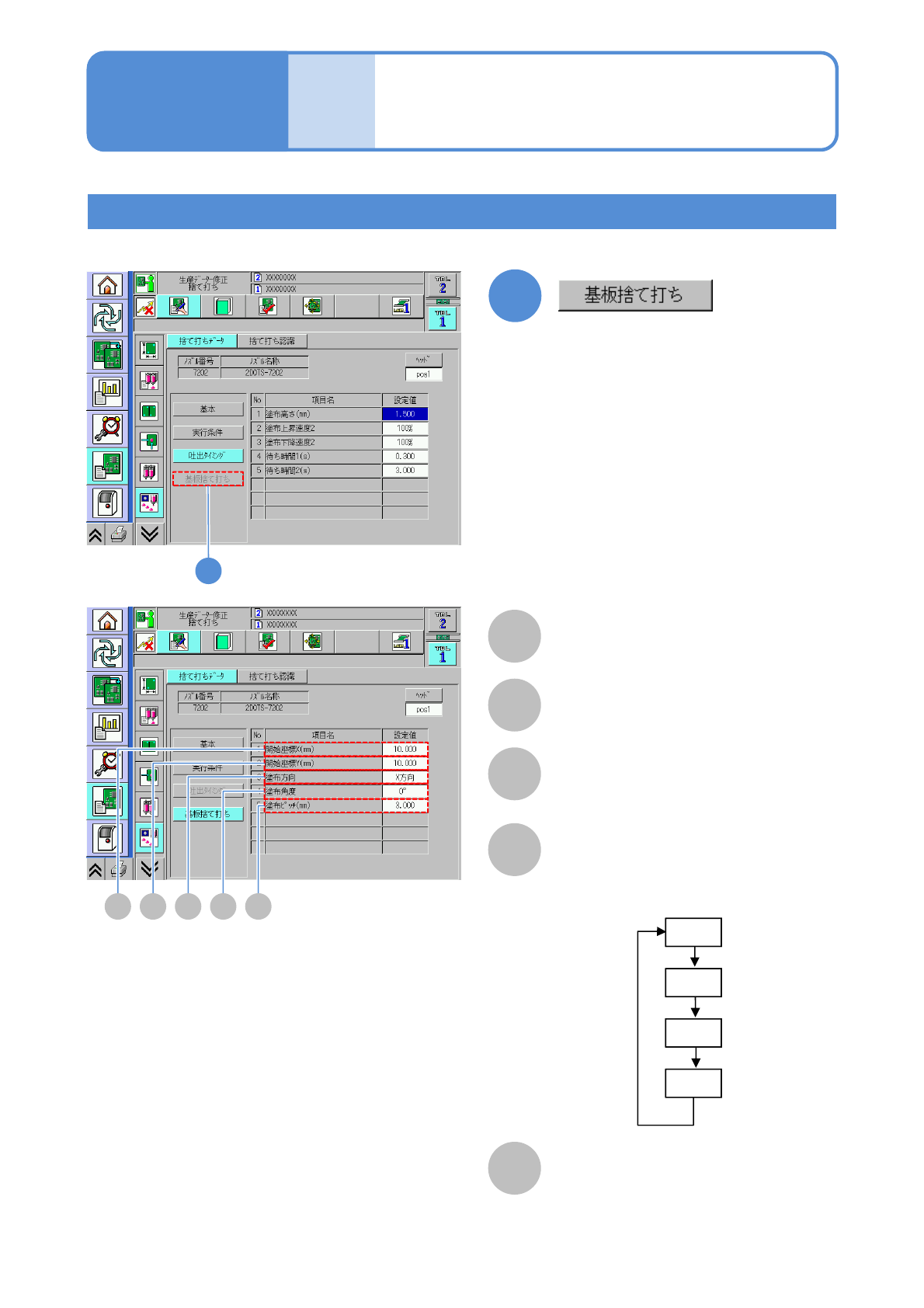 NPM-W 2 EJM7DJ-MB-06O-00 6-1-18 -5 データ 修正 捨て打ちデータの修正 3 (塗布ヘッド) 操作編 6-1-18 基板捨て打ち設定 捨て打ちパターンが「基板」の場合のみ。 A A 開始座標 X(mm ) 捨て打ち開始 X 座標を表示。 1 1 B C D E B 開始座標 Y(mm) 捨て打ち開始 Y 座標を表示。 C 塗布方向 基板上への捨て打ちの場合に塗布して いく方向を表示。 D 塗布角度 E 塗…