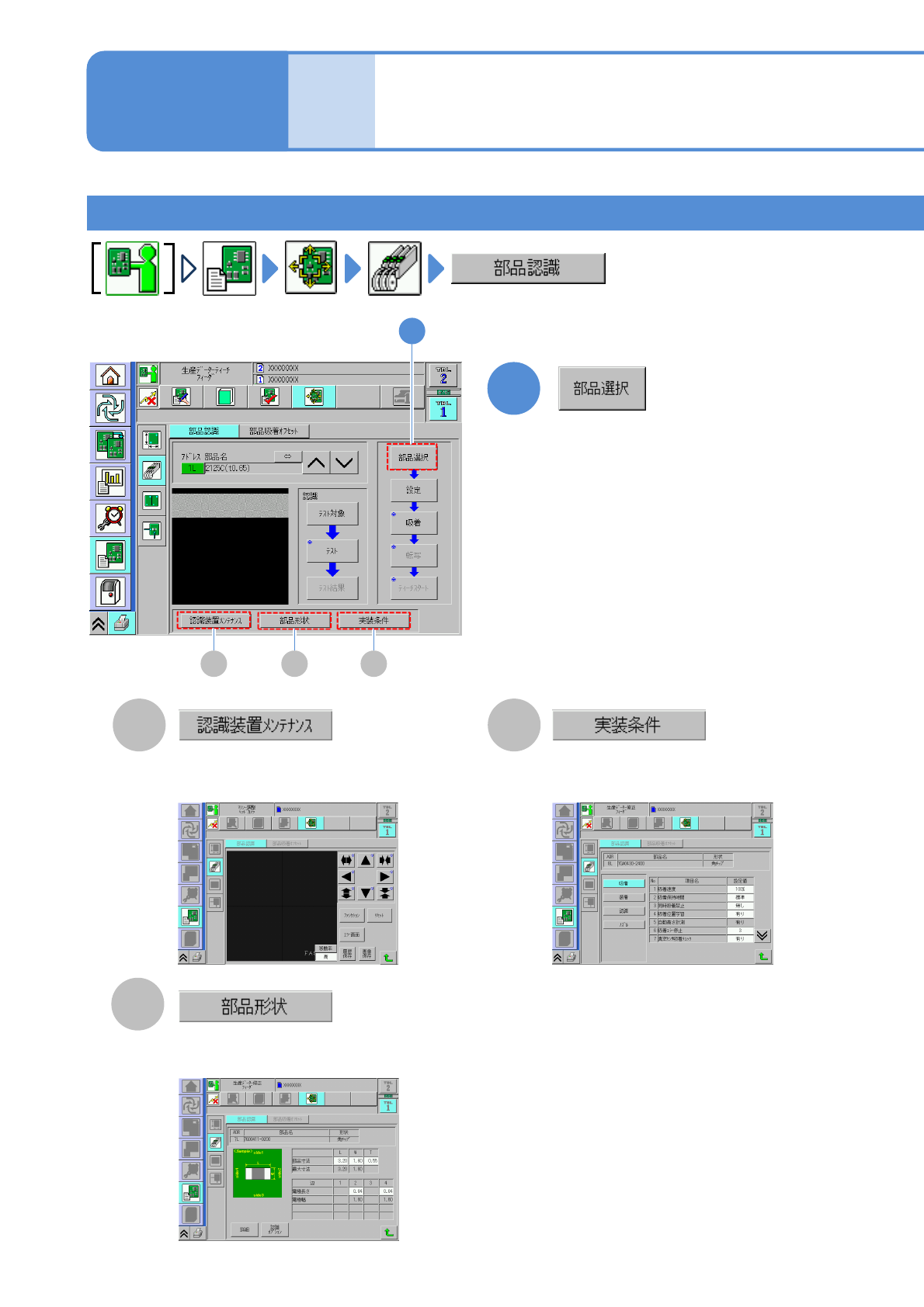 NPM-W 2 EJM7DJ-MB-06O-00 部品認識ティーチングをする 1 1 装着条件のデータ入力と修正ができ る。 ( → P.6-1-9) C A B 部品形状のデータ入力と修正ができる。 ( → P.6-1-8) すべての認識処理動作が確認できる 。 ( → P.7-2-11) 6-2-4 -3 1 C A B 認識する部品を選ぶ画面が表示され る。 生産 データ ティーチ ング 部品認識ティーチング 2 操作編 6-2-…