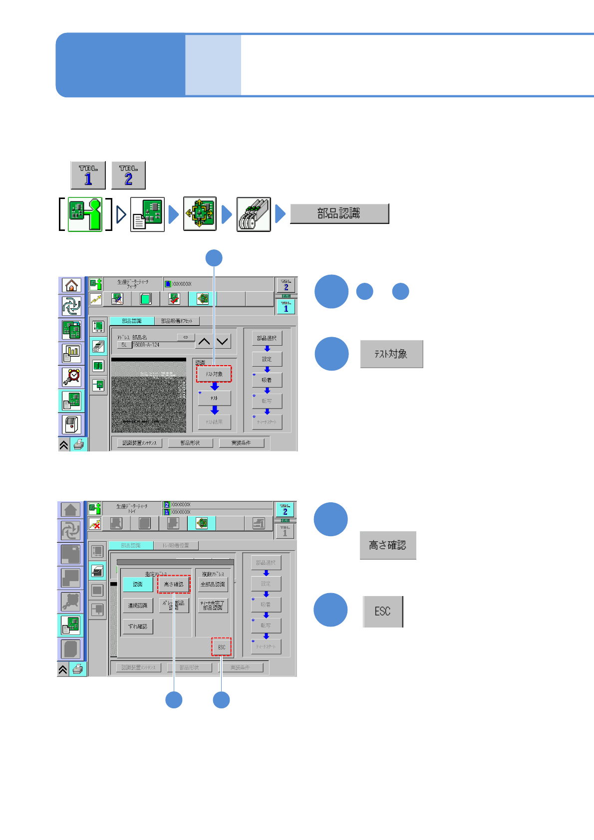NPM-W 2 EJM7DJ-MB-06O-00 生産 データ ティーチ ング 装着/吸着/転写高さ 確認 2 3 3 6-2-7- 1 装着ヘッドのXYZ軸を動作させ、装着/ 吸着/転写するときのノズルの高 さを目視で確認する方法を説明し ます。 2 1 ~ を行う ( → P.6-2-4) 1 15 認識方法を選ぶ 操作編 6-2-7 ● とも行ってください。 4 4