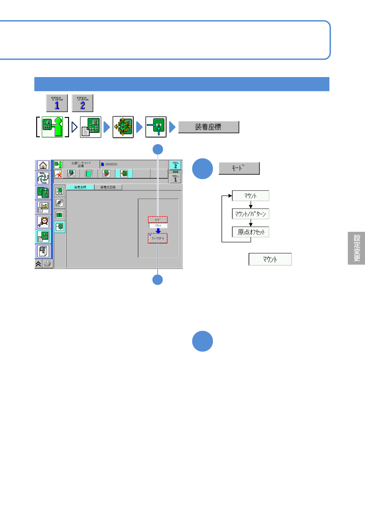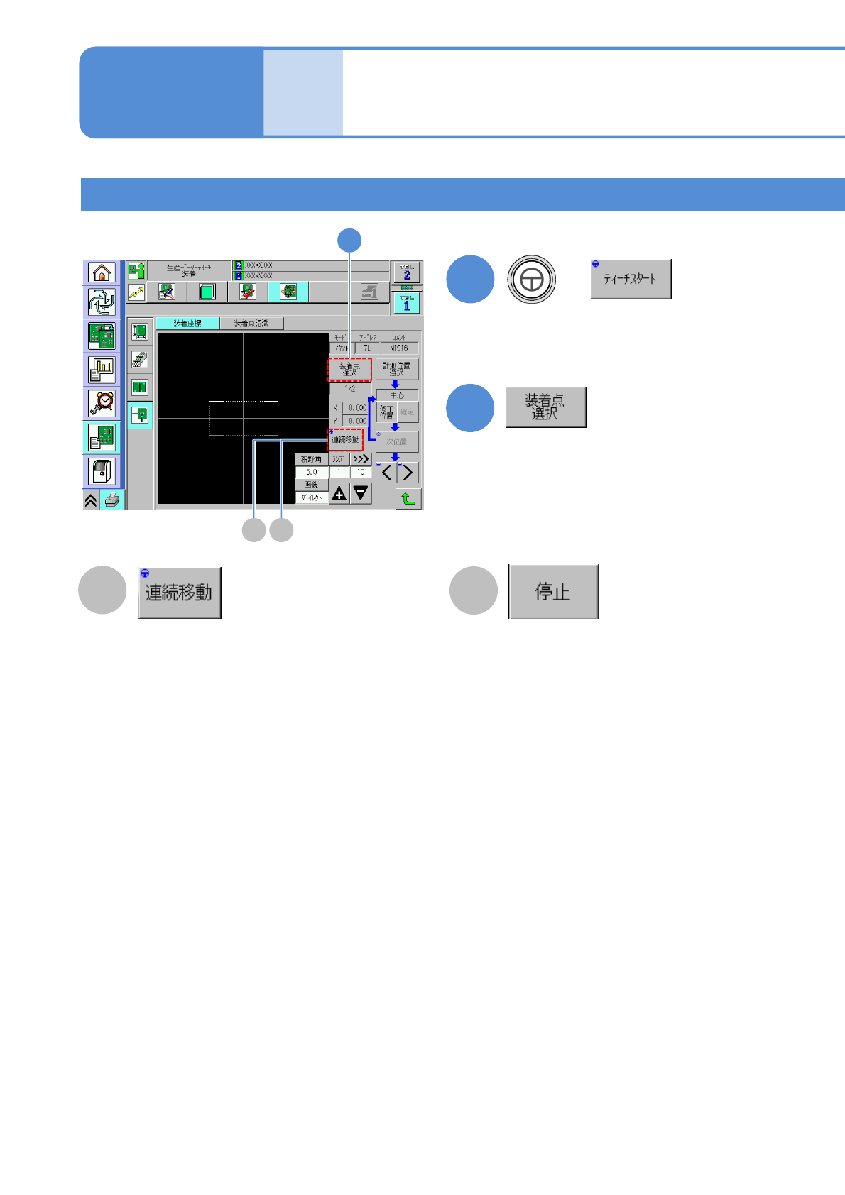 NPM-W 2 EJM7DJ-MB-06O-00 6-2-9 -5 生産 データ ティーチ ング 装着座標ティーチング 3 操作編 6-2-9 部品でティーチングする(計測方法: 1 点) 2 3 + A B 表示が“停止”に変わります。 ヘッドが次の座標に移動し、設定された確認時間 *1) 停 止後、自動的に次の座標に移動します。最終座標に な るまで移動を繰り返します。 ティーチングを行う座標で [ 停止 ] ボタンを押 下してく …
