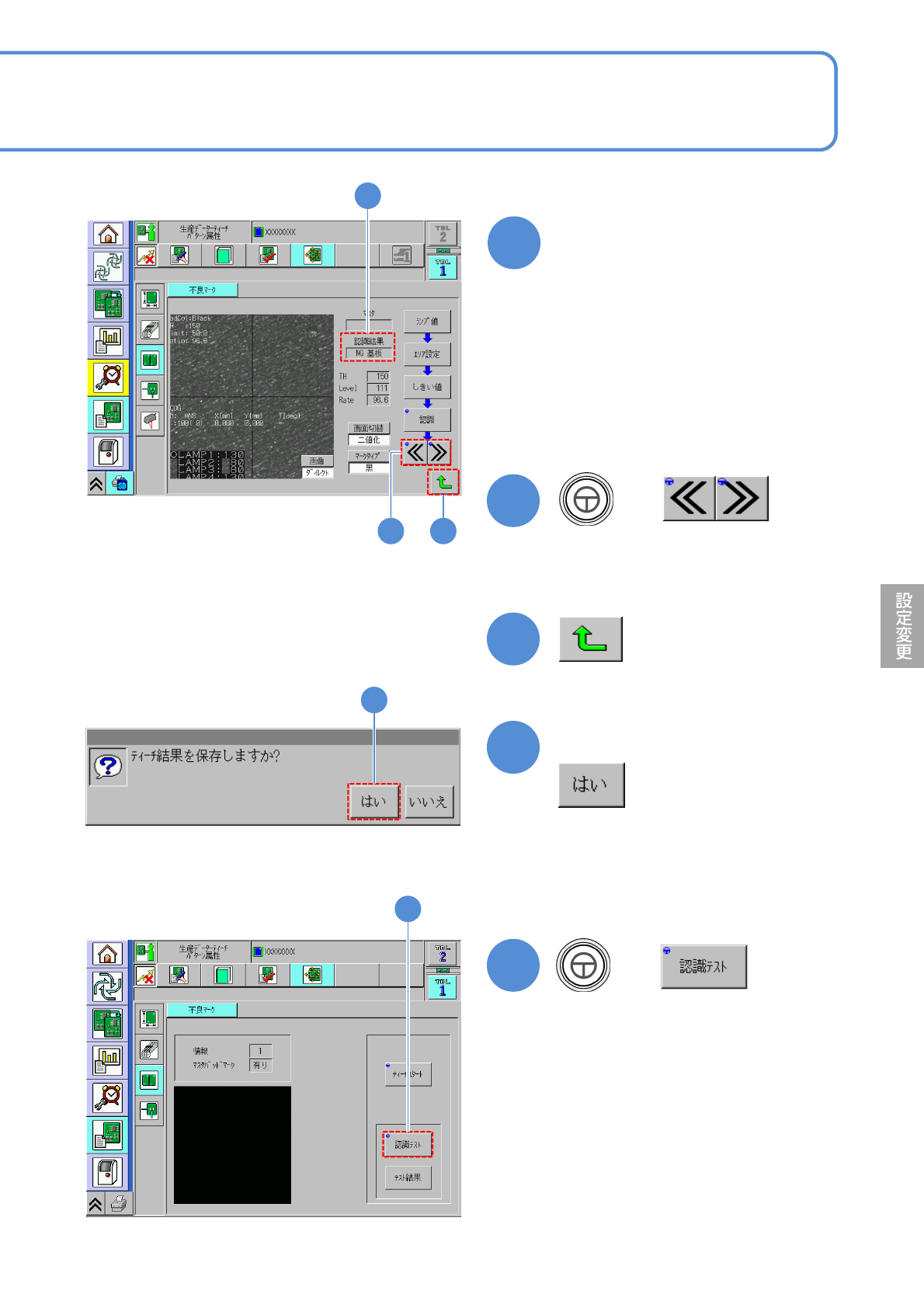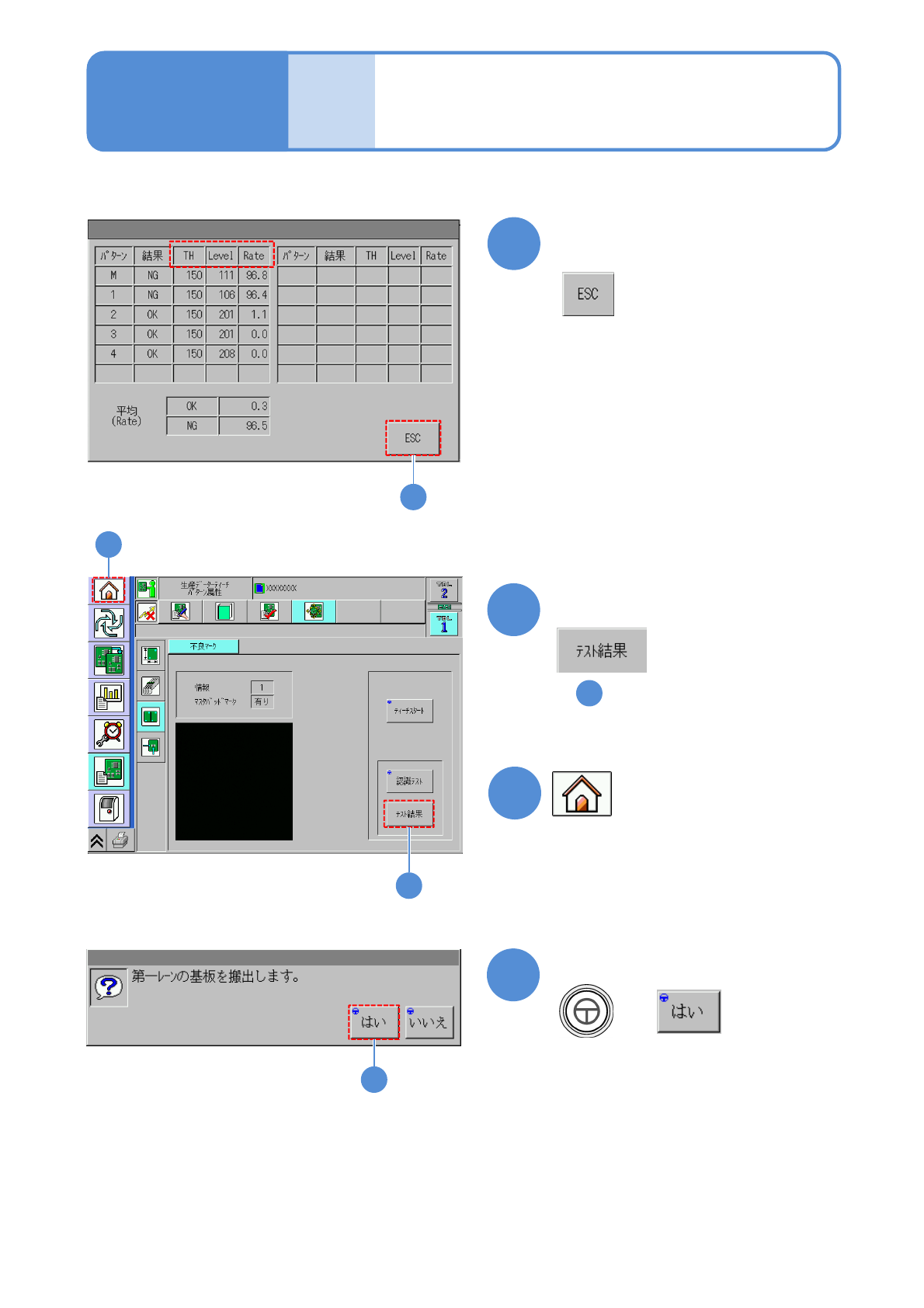 NPM-W 2 EJM7DJ-MB-06O-0 0 6-2-10 -5 生産 データ ティーチ ング 不良マーク認識 ティーチング 3 操作編 6-2-10 17 メッセージを確認して 15 テスト結果を再度確認するとき ( のテスト結果が表示される) 15 11 14 認識結果を確認したあと 14 16 ●ほかの画面に遷移してもよい。 16 17 + TH : しきい値 Level : 輝度 Rate : 画素比率