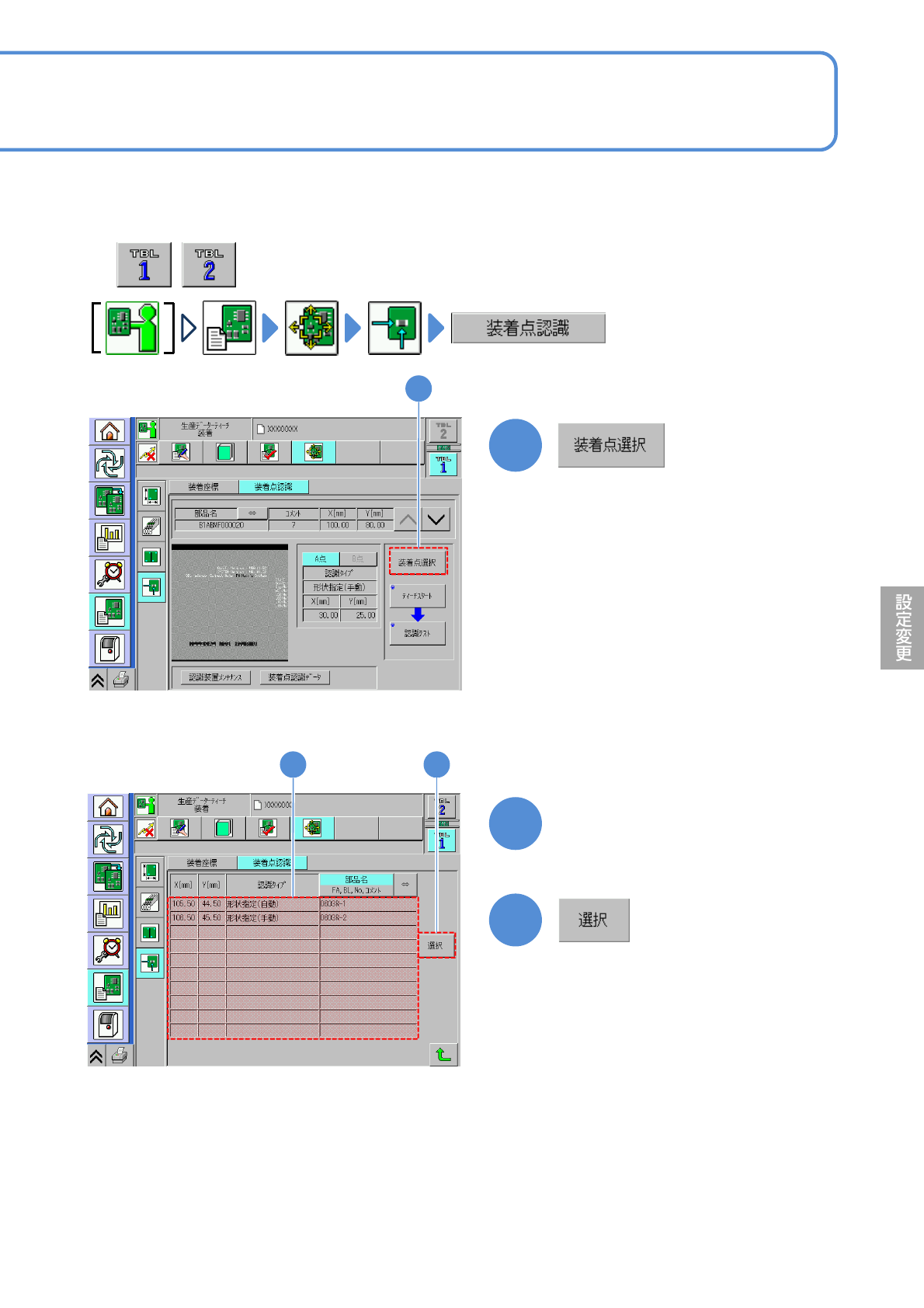 基板上に部品を装着する位置を計測し、本来の位置との差分である補正値をティーチングします。
