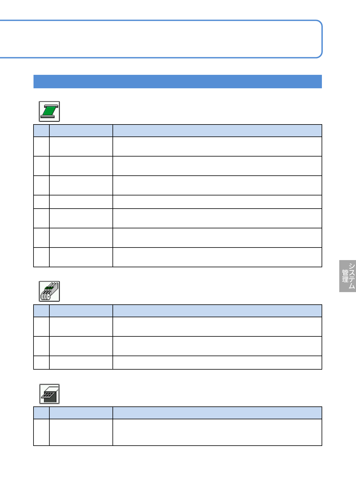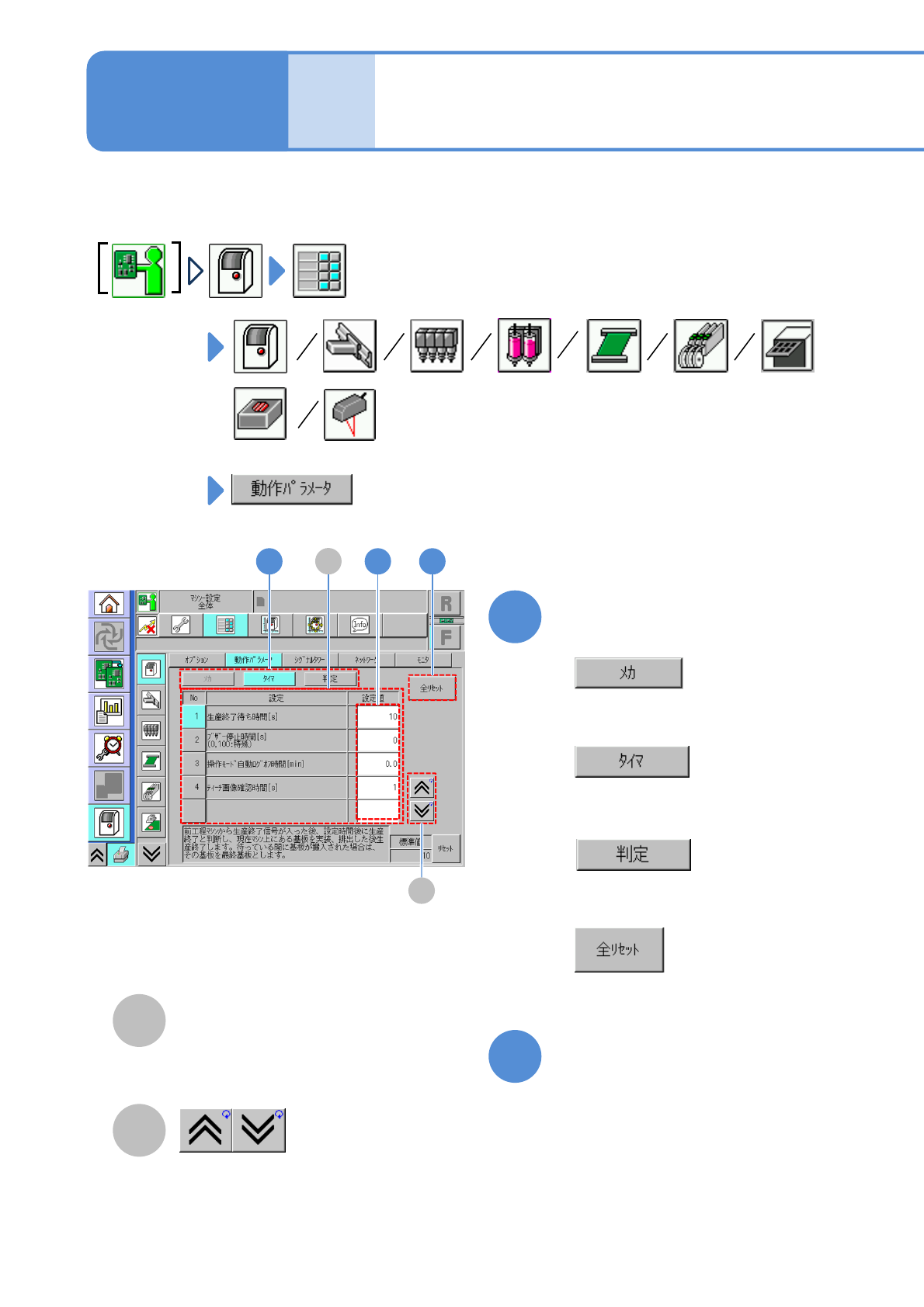 NPM-W 2 EJM7DJ-MB-07O-0 0 ユニット 設定 B 1 1 2 A 動作パラメーター の設定 1 7-1-2 -1 システム動作のパラメーターを設定します。 A B 操作編 7-1-2 動作パラメーターの設定状態 前後の表が表示される。 1 2 動作パラメーターの種類を選ぶ ■メカ動作を設定するとき ■タイマーを設定するとき ■判定値を設定するとき 画面上の必要な箇所のデータを 修正する ●画面に触れると、入力画面が…