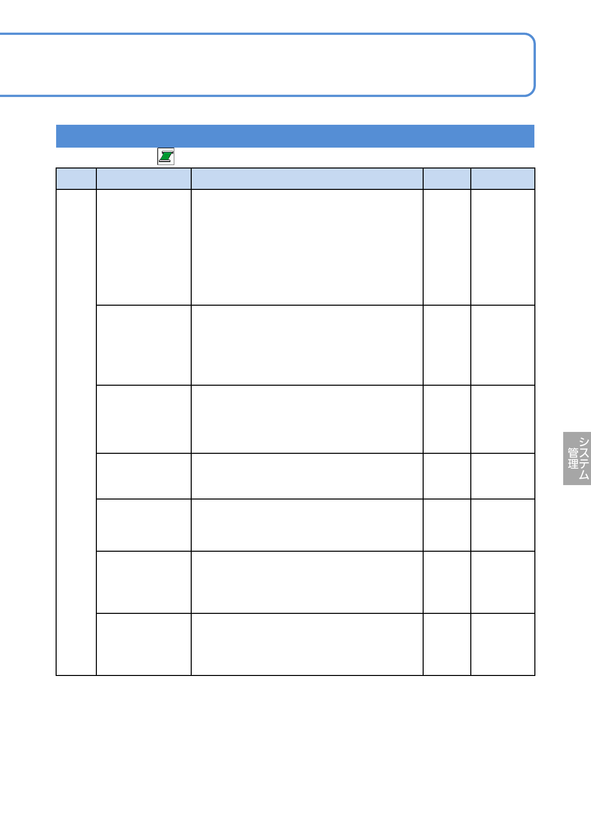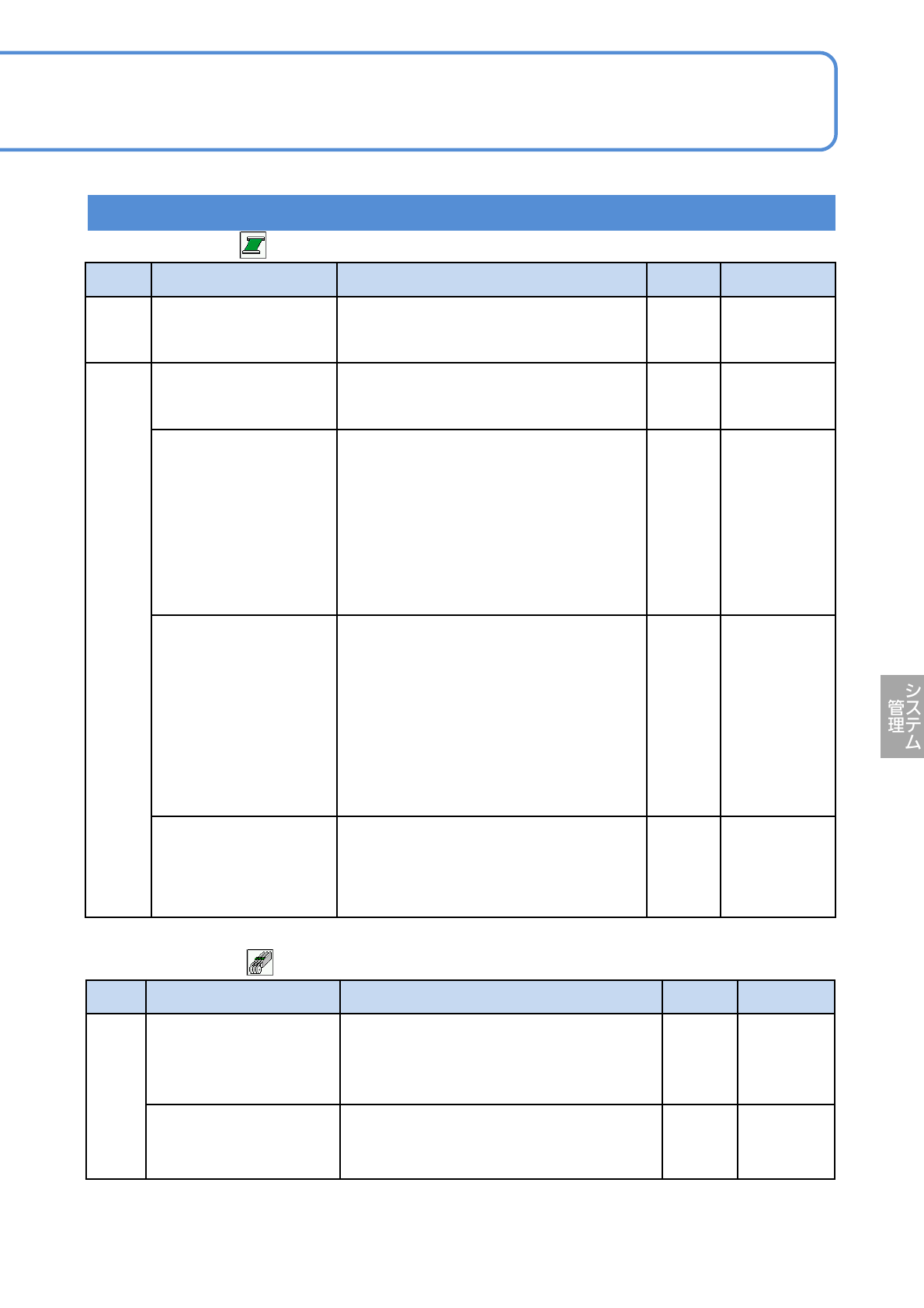 NPM-W 2 EJM7DJ-MB-07O-00 ユニット 設定 7-1-2 -7 設定の内容 6 動作パラメーター の設定 4 操作編 7-1-2 ■コンベヤー (3/4) 種類 項目 内容 初期値 設定範囲 タイマー 同時搬送時要求信号遅延 時間 [ms] 同時搬送基板要求信号を遅延させるための 時間を設定する。切り欠き基板など、基板 クランプのタイミングを調整するときに使 用する。 0 0 ~ 20000 F Y クランプ開始遅延…