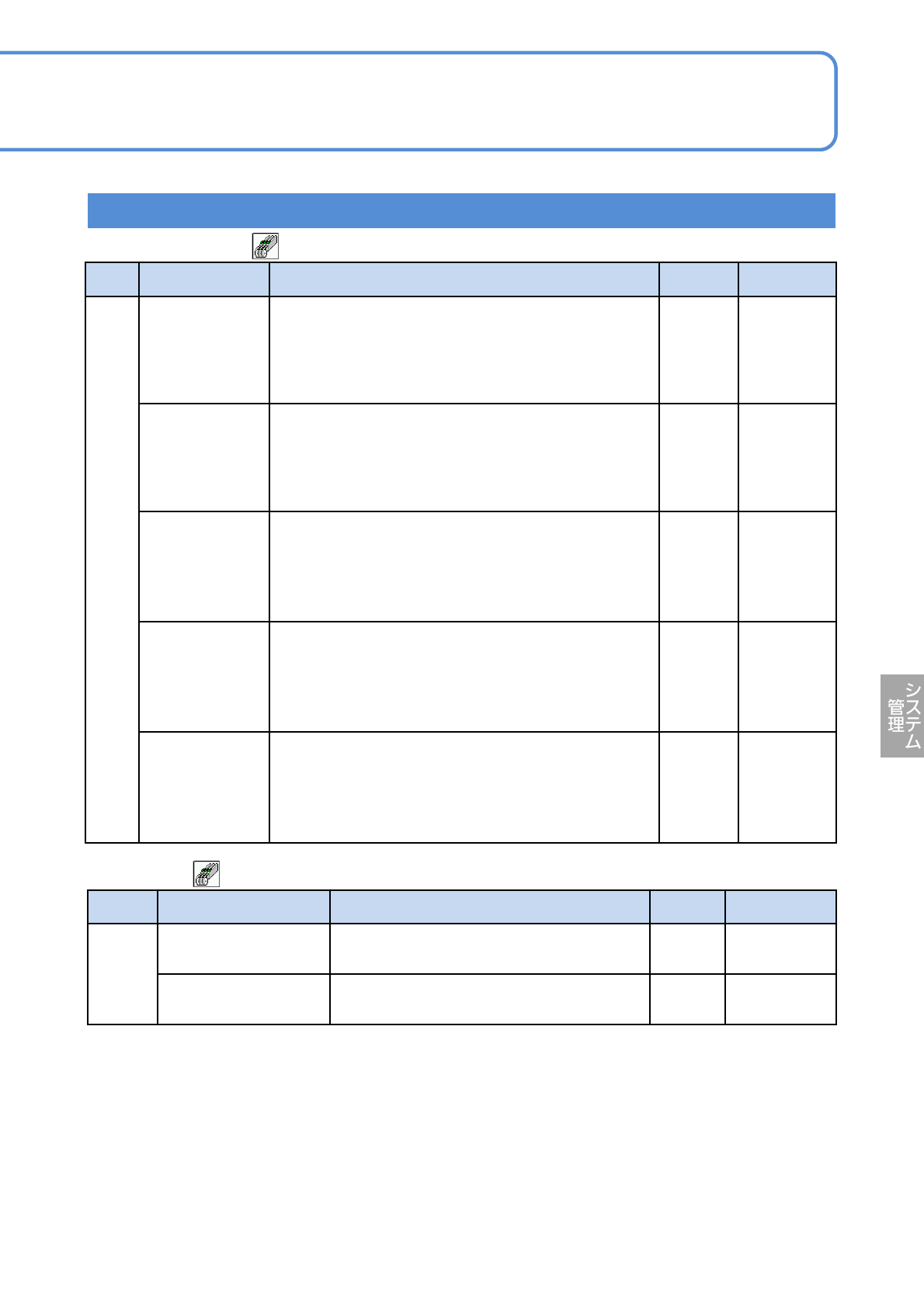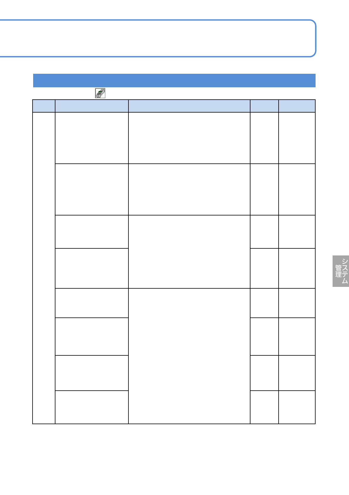 NPM-W 2 EJM7DJ-MB-07O-00 ユニット 設定 7-1-2 -11 設定の内容 10 動作パラメーター の設定 6 操作編 7-1-2 種類 項目 内容 初期値 設定範囲 判定 フィーダーメン テナンス警告率 [%] フィーダーのメンテナンス回数が「フィーダーメン テ ナンス回数×設定値」の回数を超えると、フィーダ ー メンテナンス警告を表示する。 ●「 100 」のときは警告だけ が表示され、運転不可に はならない。…