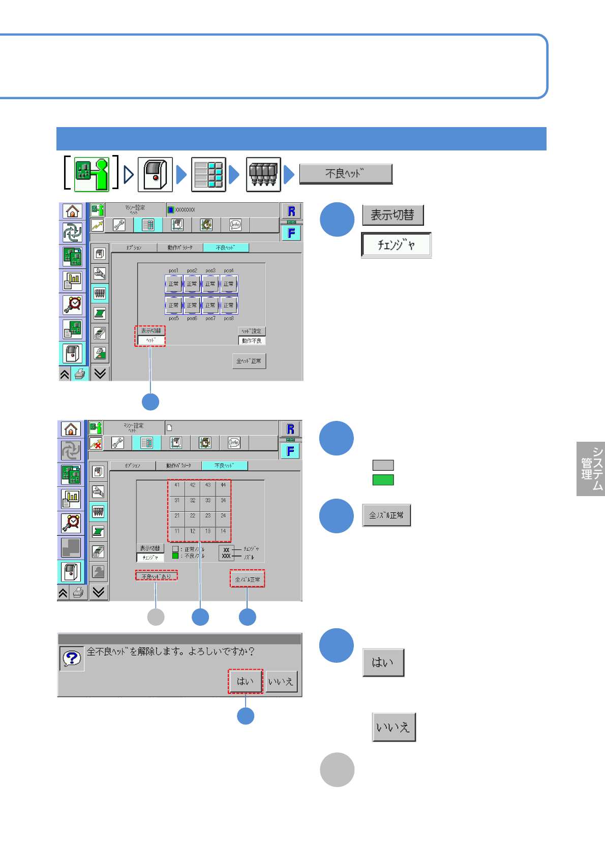 NPM-W 2 EJM7DJ-MB-07O-00 ユニット 調整 全軸の原点復帰 7-2-1 -1 全軸の原点復帰を行います 操作編 7-2-1 1 + 1 A A ( 原点復帰が開始され、結果が表示される ) 原点復帰の結果 ■原点復帰できたとき ■原点復帰できなかったとき ●当社にお問い合わせください。