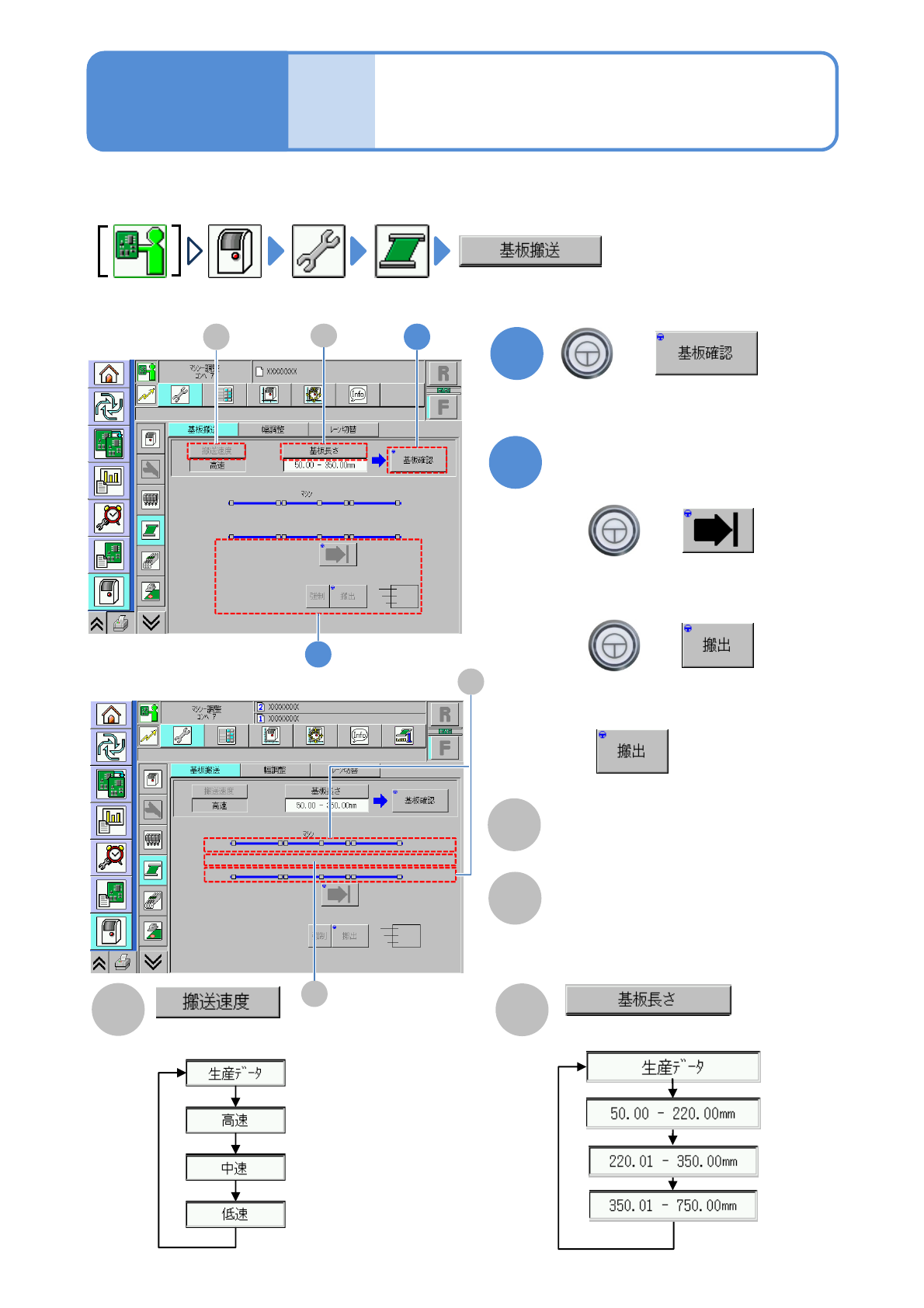NPM-W 2 EJM7DJ-MB-07O-00 ユニット 調整 基板の搬送確認 7-2-9 ( 搬送コンベヤー上に基板があるとき、 位置が表示される ) 基板の搬送動作が正常であることを確認します。 ●デュアルレーンモードのときは、事前にレーンを 選ぶ。 1 B + A 2 + + 1 C 2 操作編 7-2-9 基板の長さを選ぶ。 搬送の速度を選ぶ。 ■後工程からの要求信号なしで搬出 するとき が有効になる。 ( 基板が選んだ位置に…