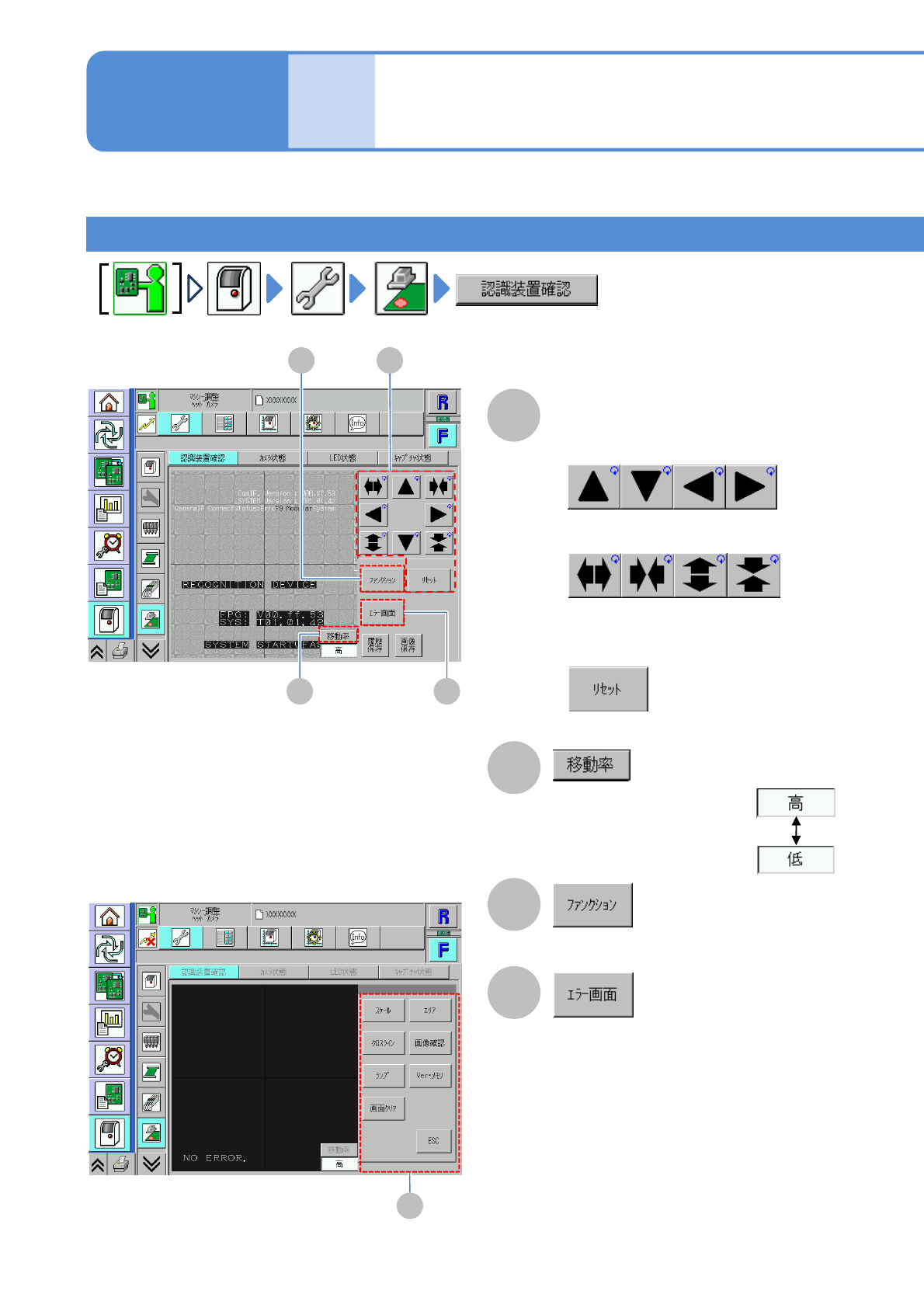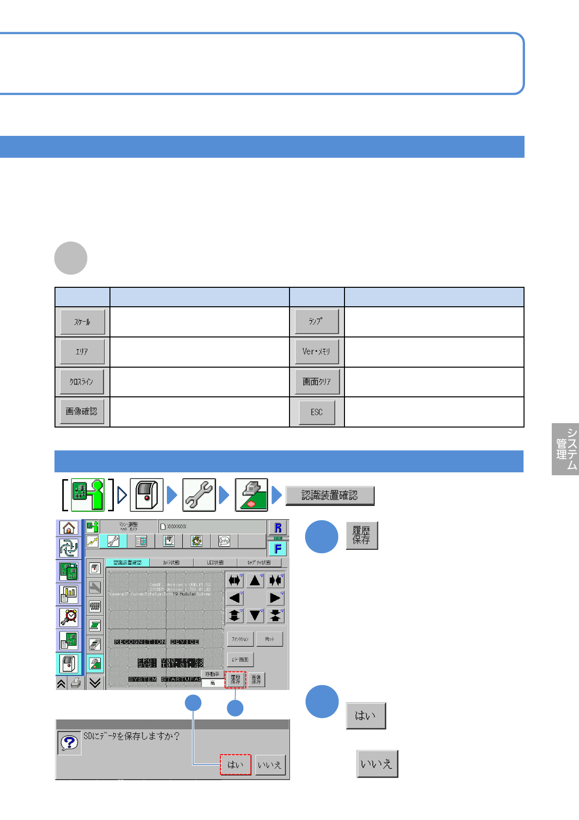 NPM-W 2 EJM7DJ-MB-07O-0 0 ボタン 機能 ボタン 機能 画面に同心円のスケールを表示する 。 明るさ調整画面を表示する。 画面に四角枠を表示する。 認識システムのバージョンを表示 する。 画面にクロスラインを表示する。 表示中の画像を画面から消す。 輝度選択画面を表示する。 元の画面に戻す。 7-2-1 1 -2 画面表示ファンクション 認識エラーの履歴を保存する 1 2 1 2 ■保存しないとき メッセージを確…