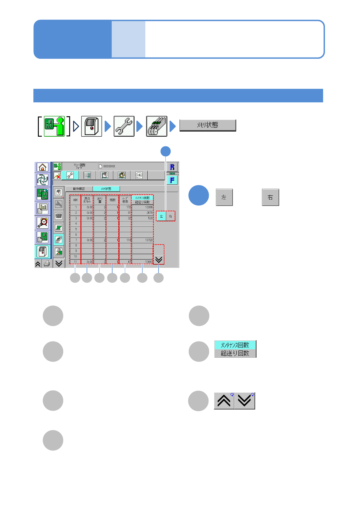 NPM-W 2 EJM7DJ-MB-07O-00 ユニット 調整 7-2-13 -3 I 残数 フィーダー内の部品の残数。 メモリー状態を確認する 1 J K L M N O 操作編 7-2-13 ADR( アドレス ) フィーダーを取り付ける位置。 原点オフセット フィーダーの第 2 原点オフセット。 テープ巻取 フィーダー内のテープの巻き取り量。 ●単位 :mm 送り量 フィーダーの送り量。 前後の表が表示される。 または フィーダ…