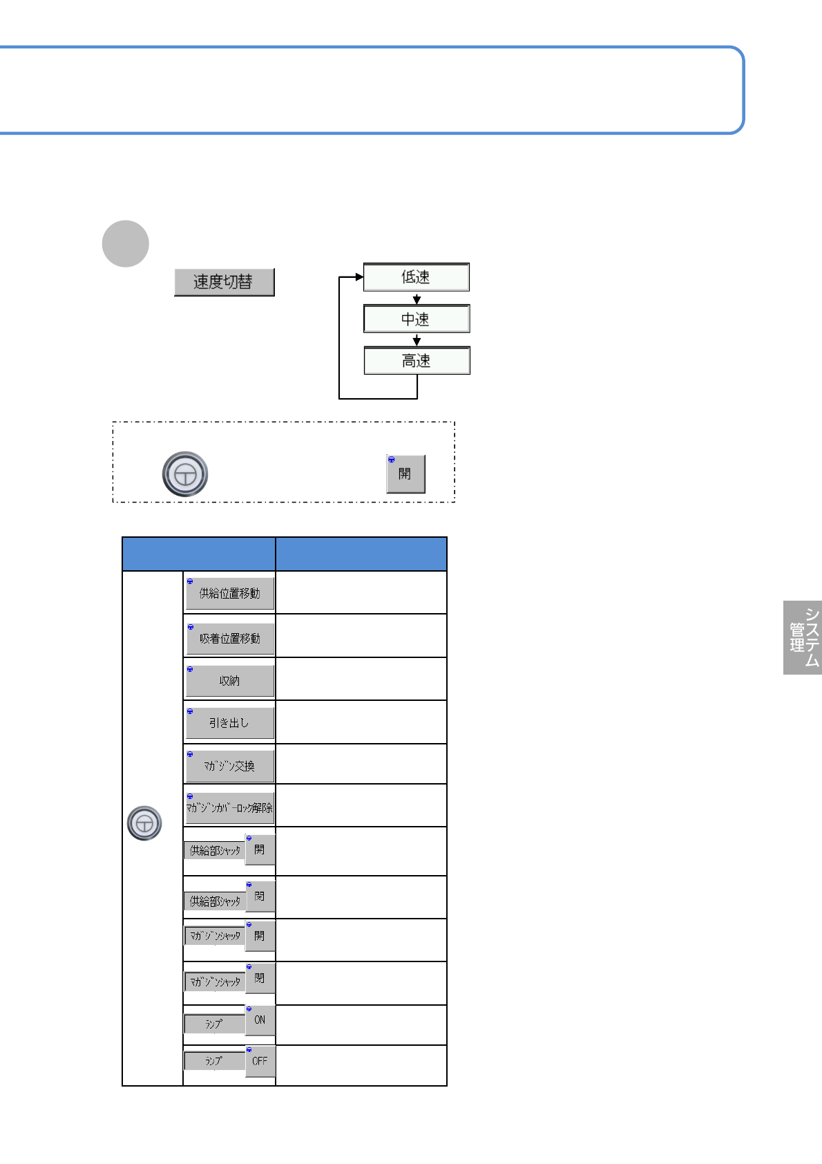 NPM-W 2 EJM7DJ-MB-07O-0 0 ユニット 調整 トレイフィーダーの 動作確認 7-2-14 -1 A B D トレイフィーダー内のそれぞれの機能の動作を確認 します。 C 1 2 操作編 7-2-14 リフター位置 リフター上にあるパレットの番号。 「リフター位置」、または「供給位置」 を選んで押すと、該当欄が「無し」に表 示される。 選択パレット 選んだパレットの番号。 ●排出パレットは、「 21 」が表示され る…
