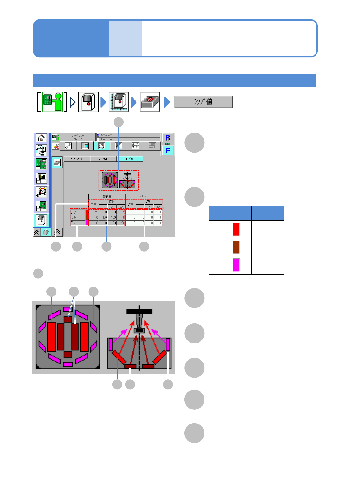 NPM-W 2 EJM7DJ-MB-07O-00 マシン パラメー ター 7-3-17 -3 マルチ認識カメラの確認 2 A 照明モード ●透 過 : 透過モード ● 1: 反射 1 モード ● 2: 反射 2 モード ● BGA :反射 BGA モード A B C D 設備に設置されている フィーダー の メモリー 情報 を 表示します 。 マルチ認識カメラランプ値 B 照明 C 基準値 各照明の照明モードごとのランプ基 準値。 D …