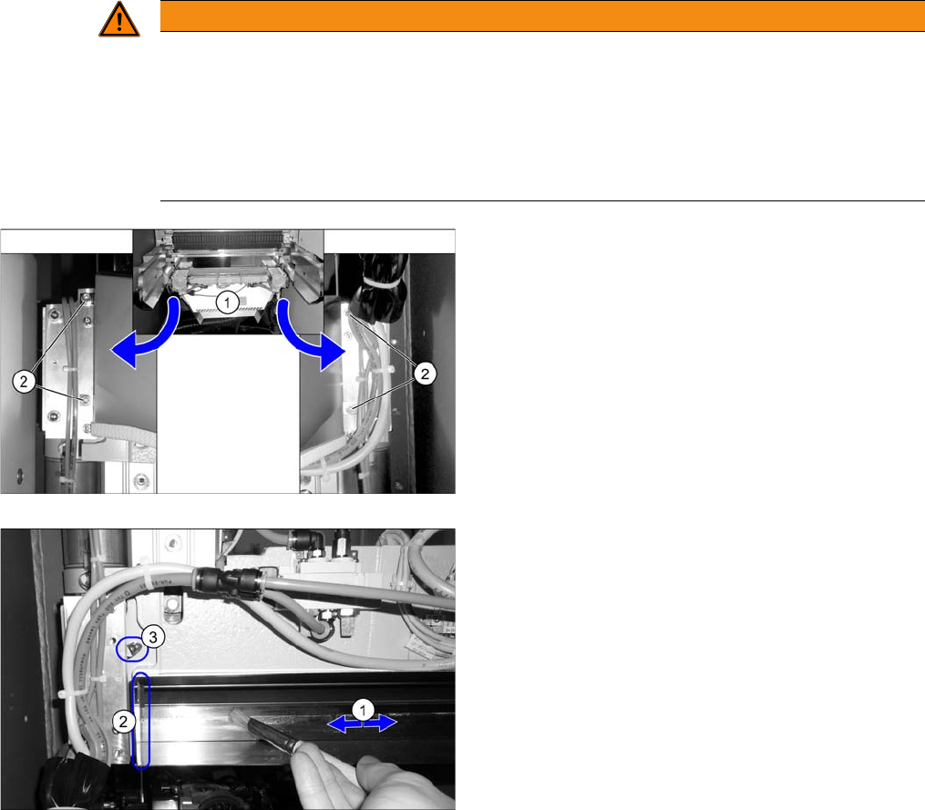 ► 拆卸废料滑道 (1)。拧松四颗固定螺丝 (2) 并将废料带