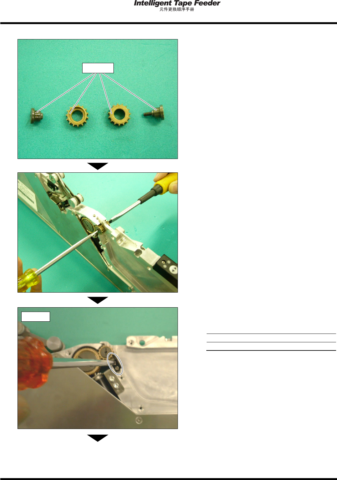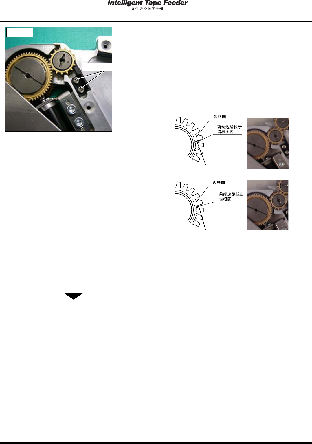 1.8 下侧导齿轮 Page 1-30 INTF-C-PEA01-A03-02 4. 确认齿轮盘的前端和齿轮圆的位置关系是 否适当。 请以目视确认从齿根圆中有没有突出 齿轮盘的 前端边缘。 请在把齿轮盘轻轻压到齿轮槽部的状 态下紧固 螺钉。 齿轮盘的凸钩前端离开齿轮槽部时 , 齿轮盘的前 端边缘从齿根圆突出, 有可能顶层带将会致使导 入动作变得异常。 ( 好的例子 ) INTF-094C INTF-234P ( 不好的例子 ) …